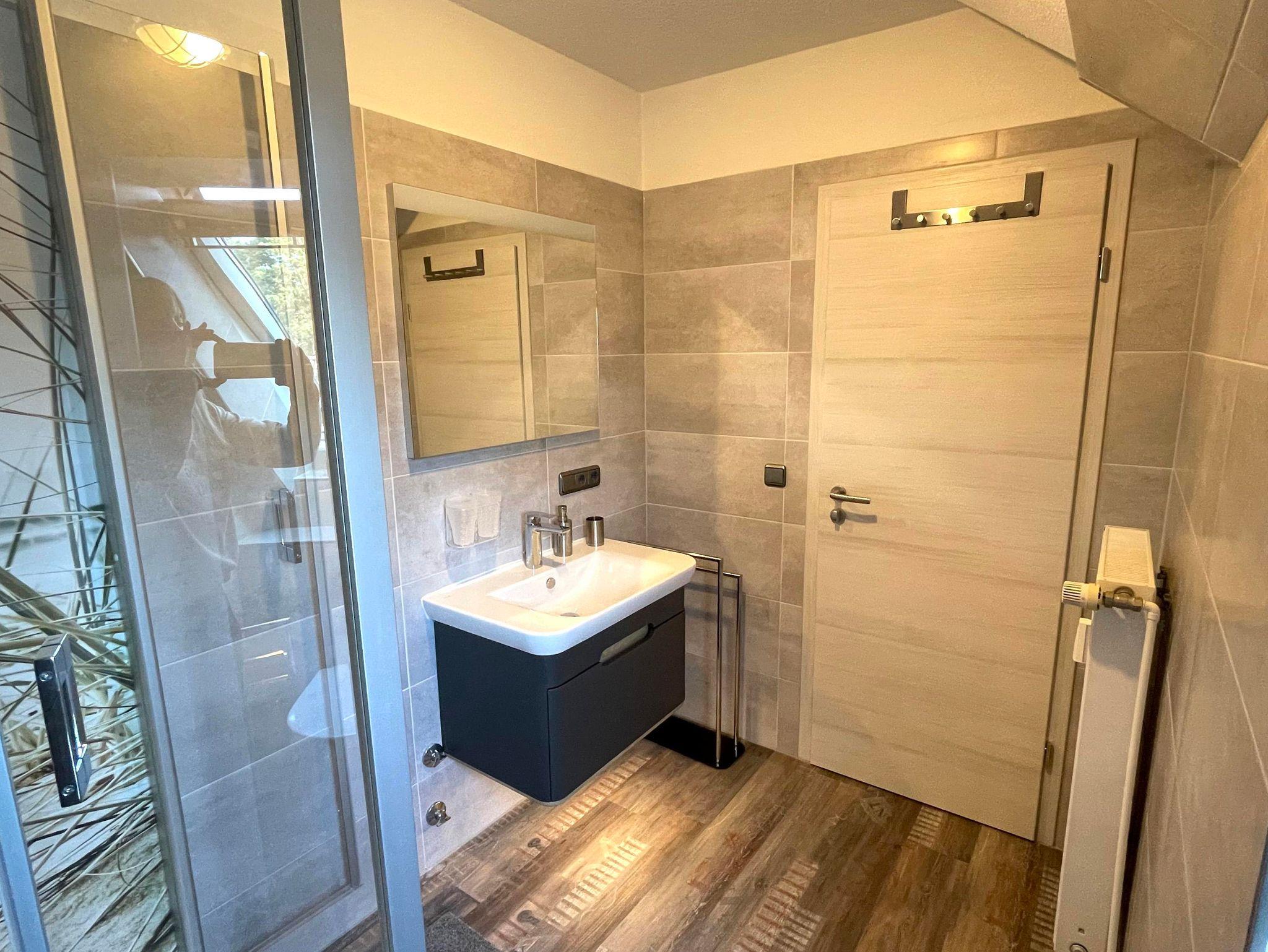 Bad: Dusche, Waschbecken, WC, Regal, Duschkabine
