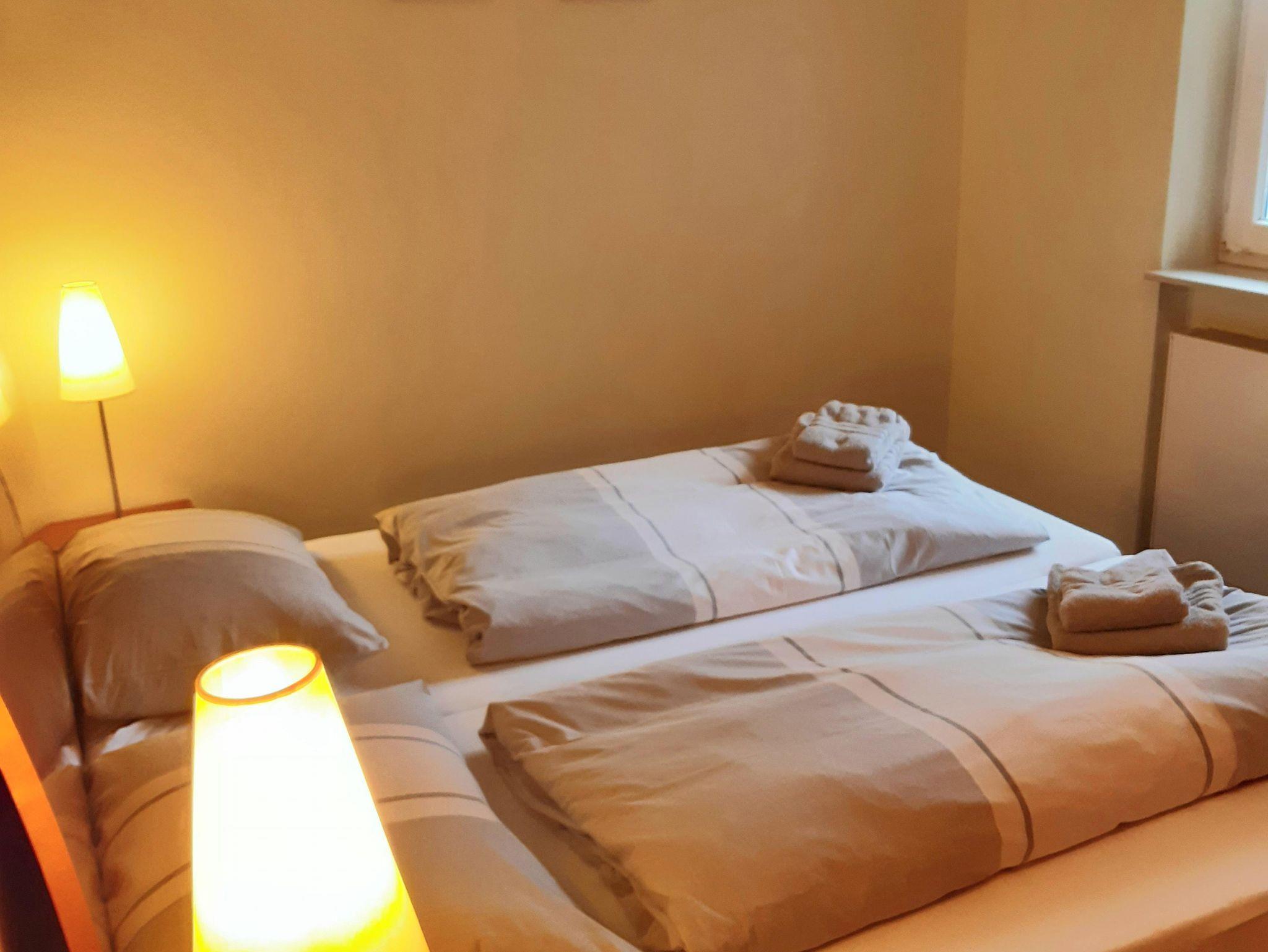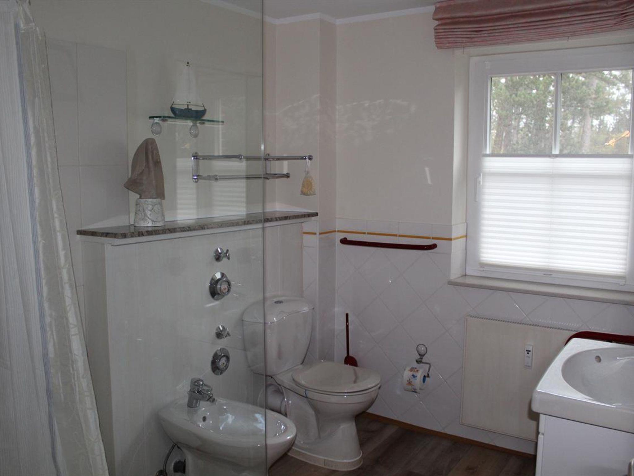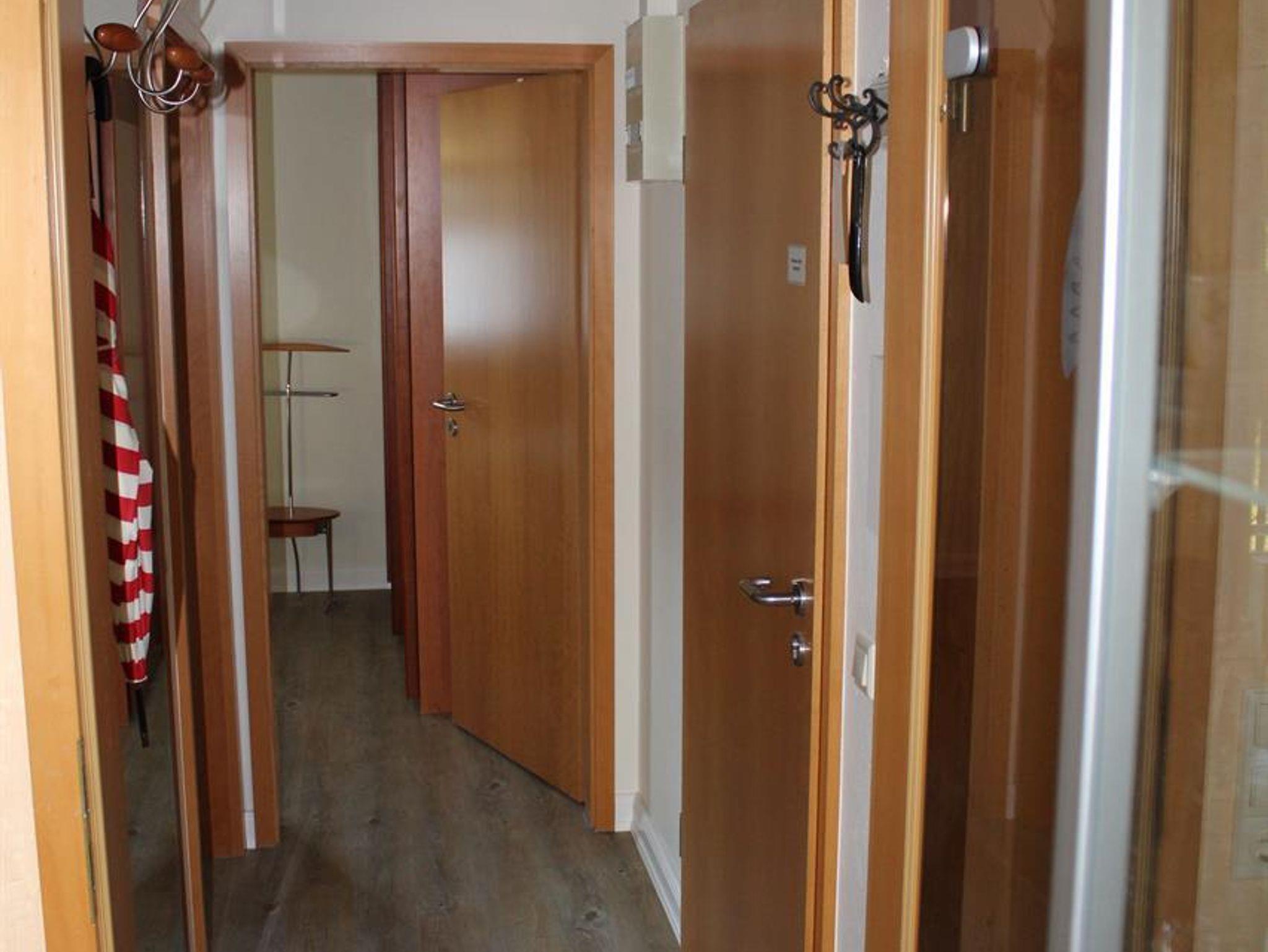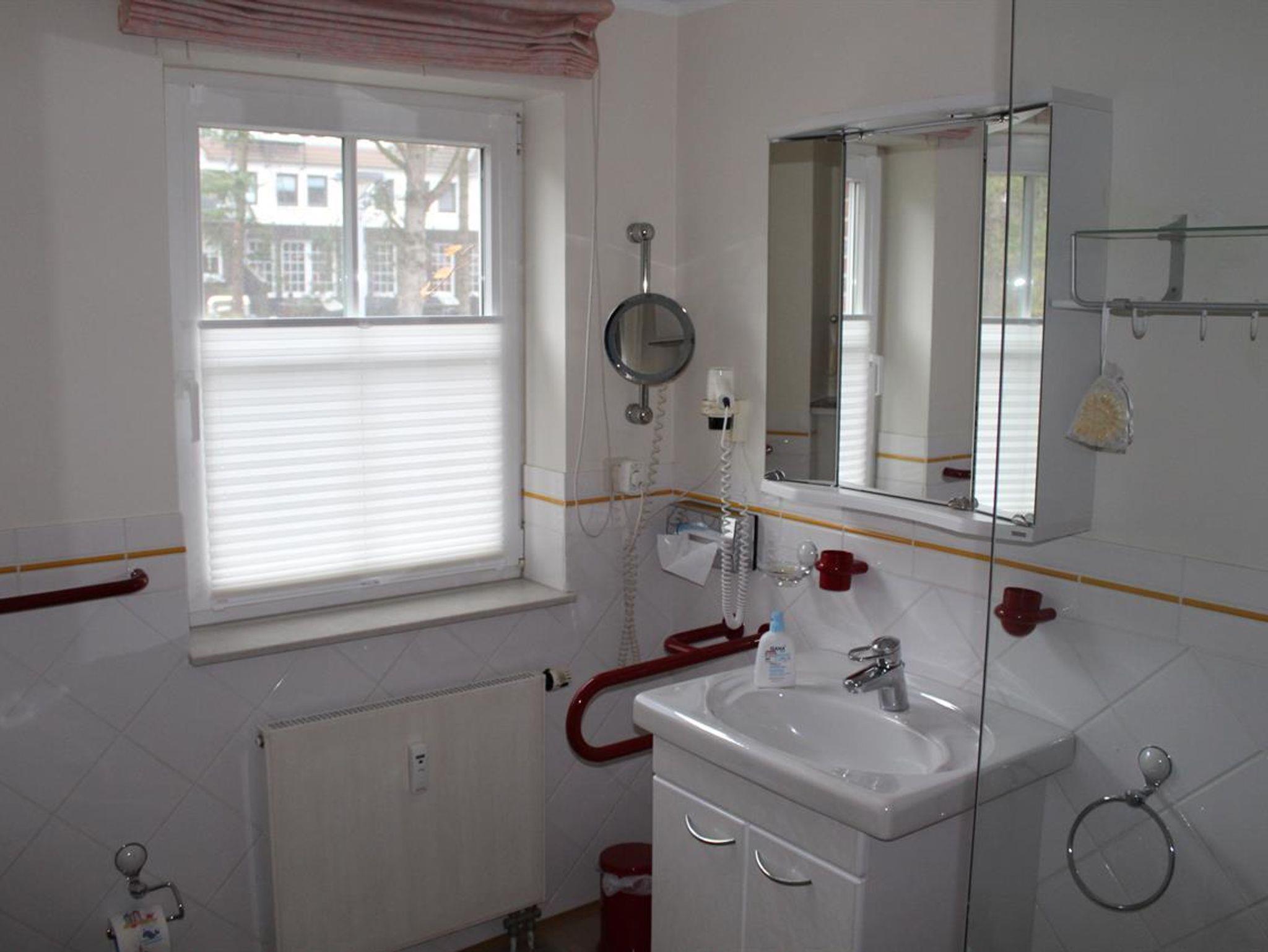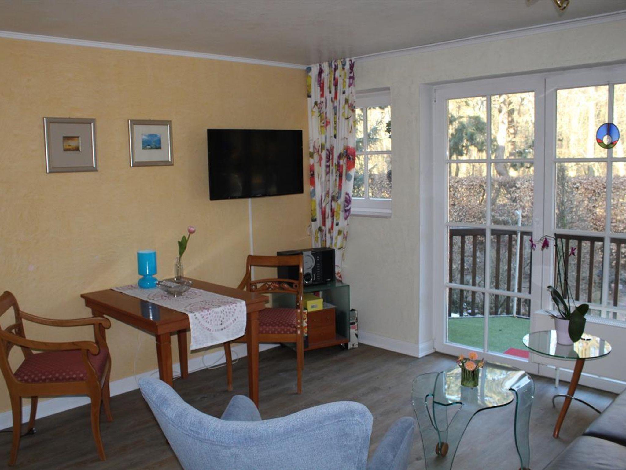 Großes Wohn-Esszimmer mit integrierter, komplett ausgestatteter Küchenzeile, einem Esstisch für 2 Personen, einer gemütlichen Sitzecke, Flachbild-Kabel-TV, CD/Radio-Stereo, Nordwest Balkon zum Kurwald gelegen.Schlafzimmer mit Doppelbett und einem geräumigen Kleiderschrank, taghelles Badezimmer mit ebenerdiger Dusche, Flur mit Garderobe und Spiegel. Alle Räume mit Teppichfußboden, Safe, kostenfreies WLAN verfügbar. Münzwaschmaschine/Trockner im Haus, reservierter PKW-Stellplatz Nr. 1, überdachter Fahrradunterstand, Nichtraucher, Haustiere willkommen. Kostenlose Saunanutzung im Haus möglich