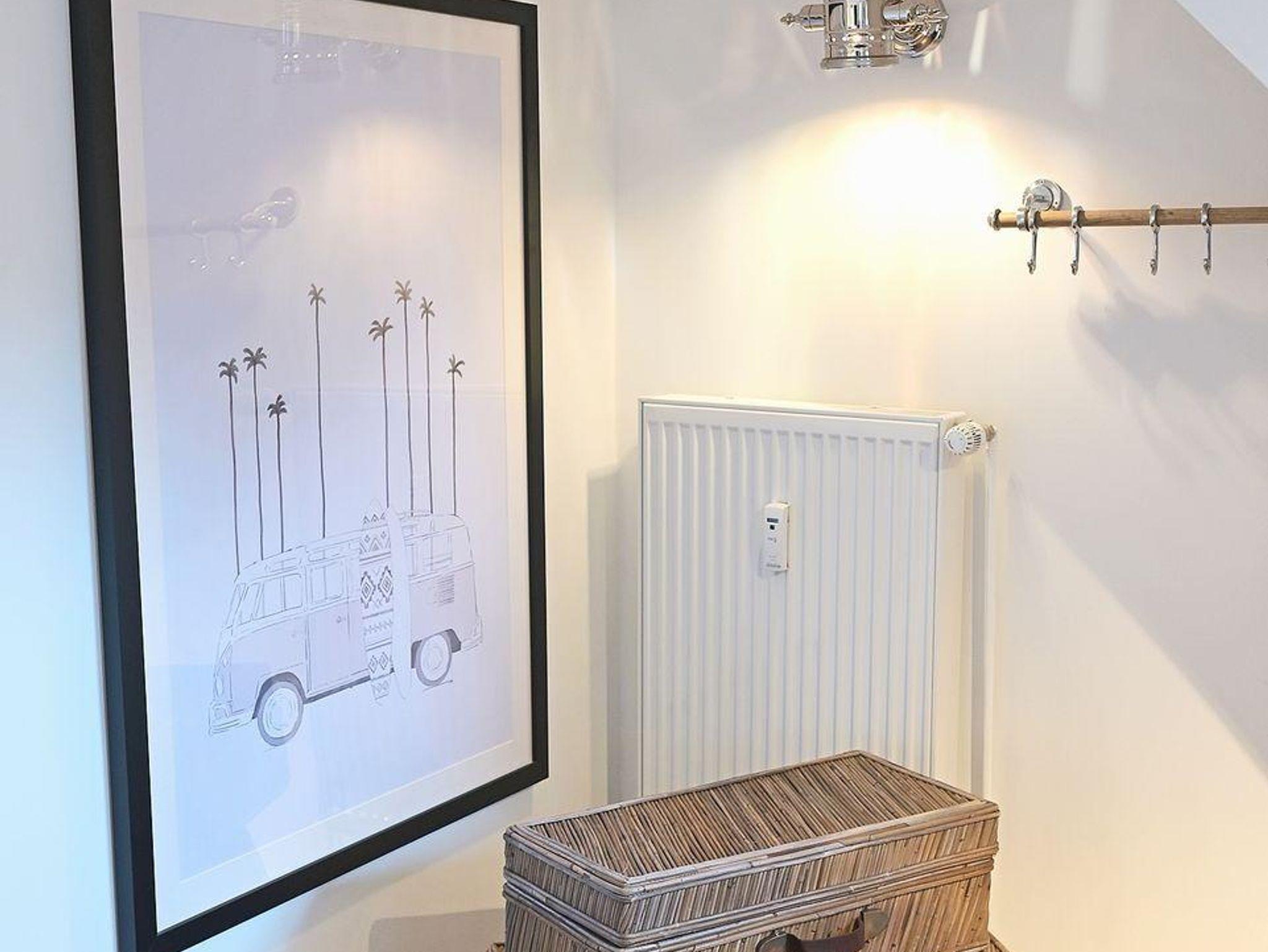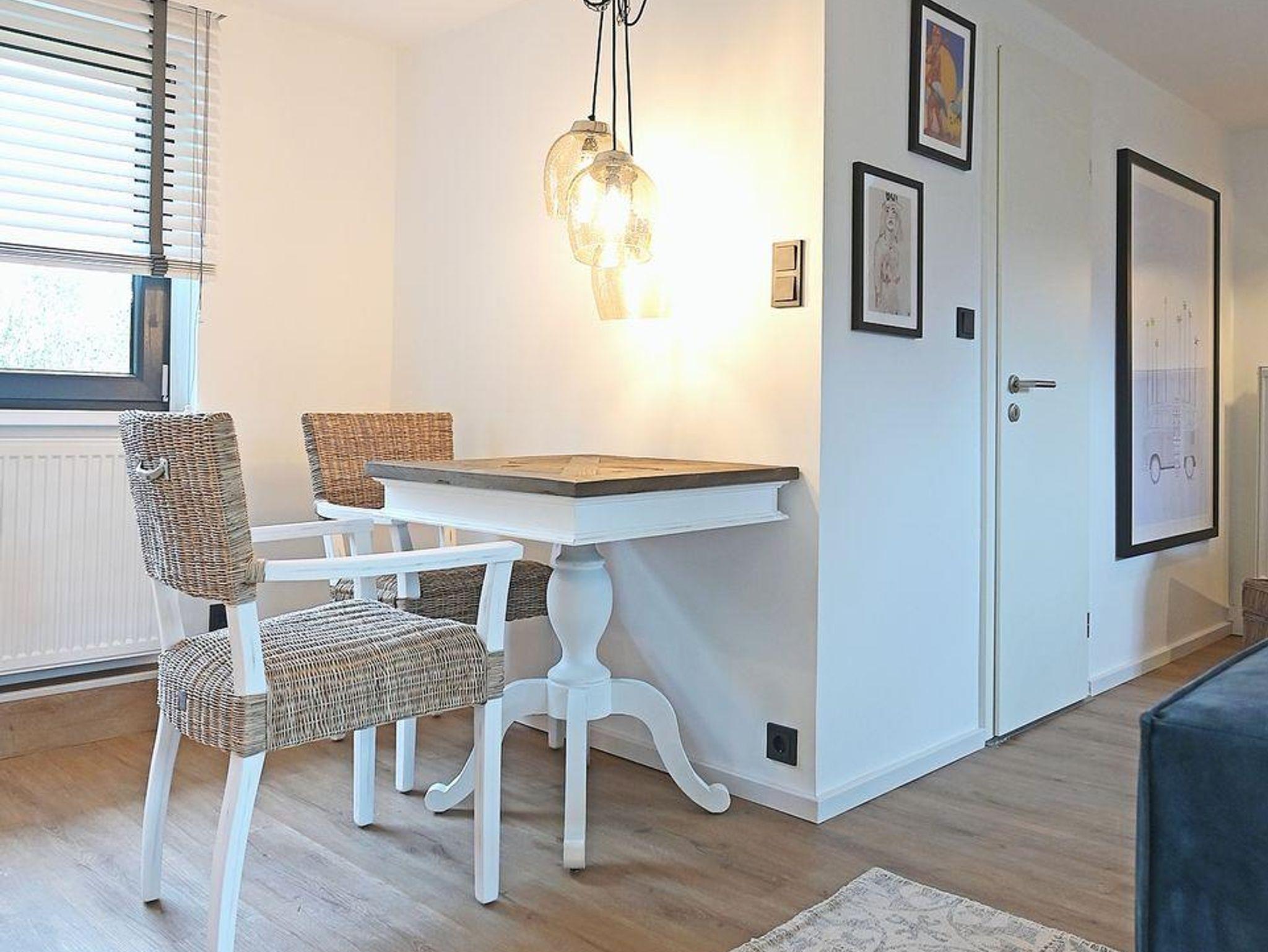 Das geräumige Badezimmer der Wohnung beeindruckt mit einer bodengleichen Regendusche. Auf der möblierten Terrasse mit einem Strandkorb können Sie den Tag stilvoll ausklingen lassen.