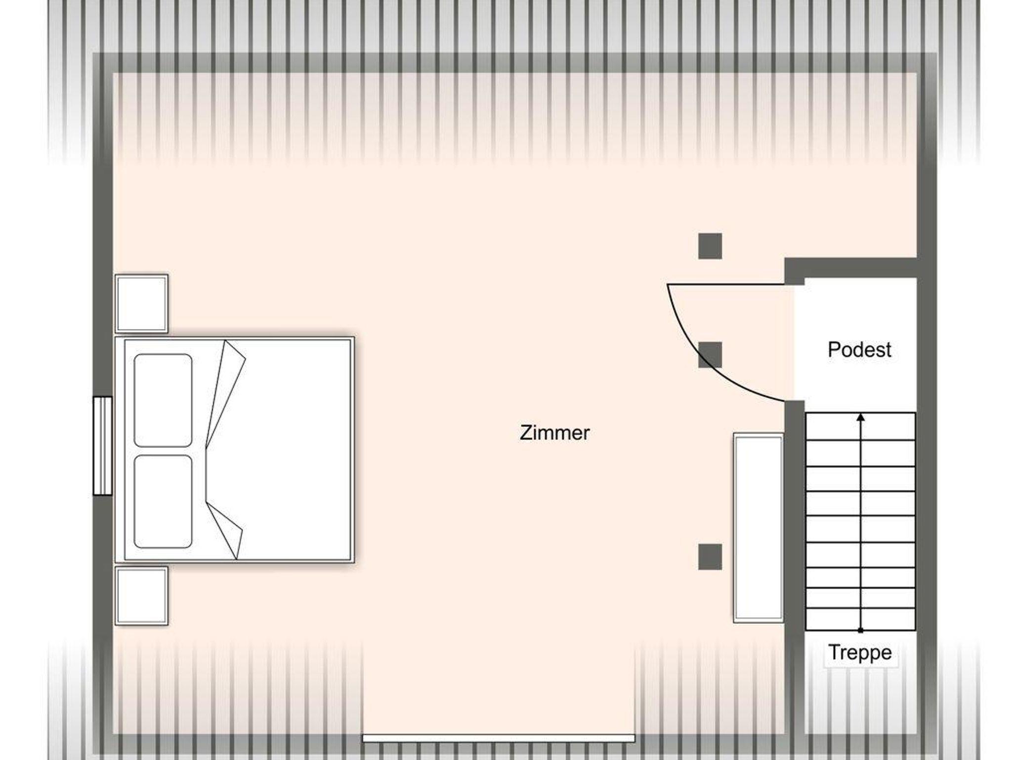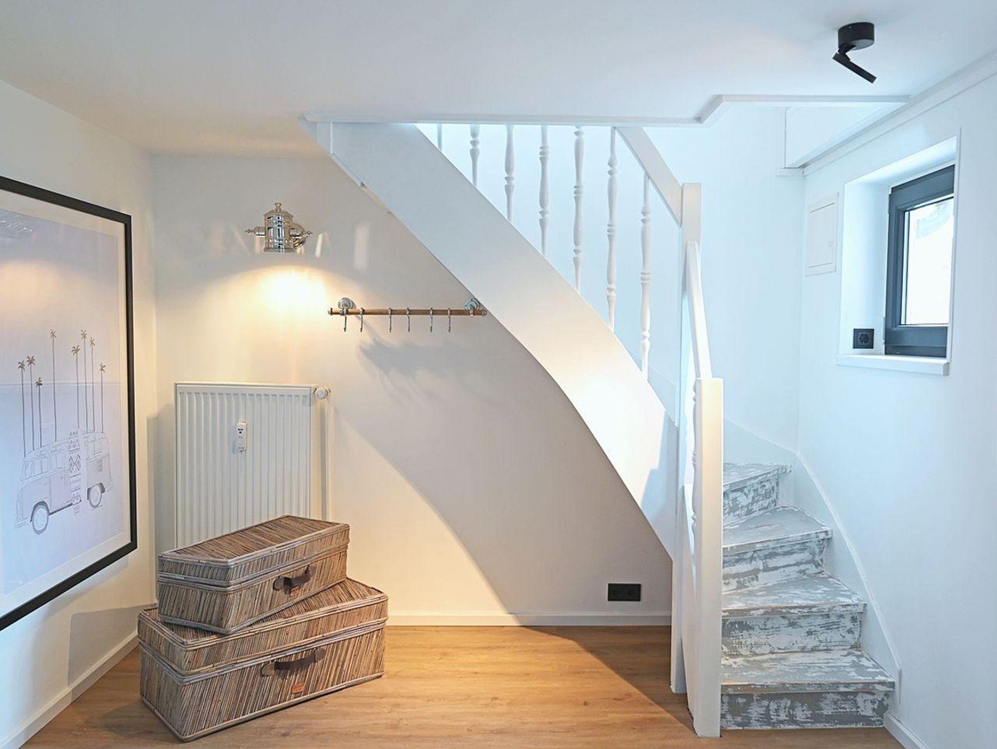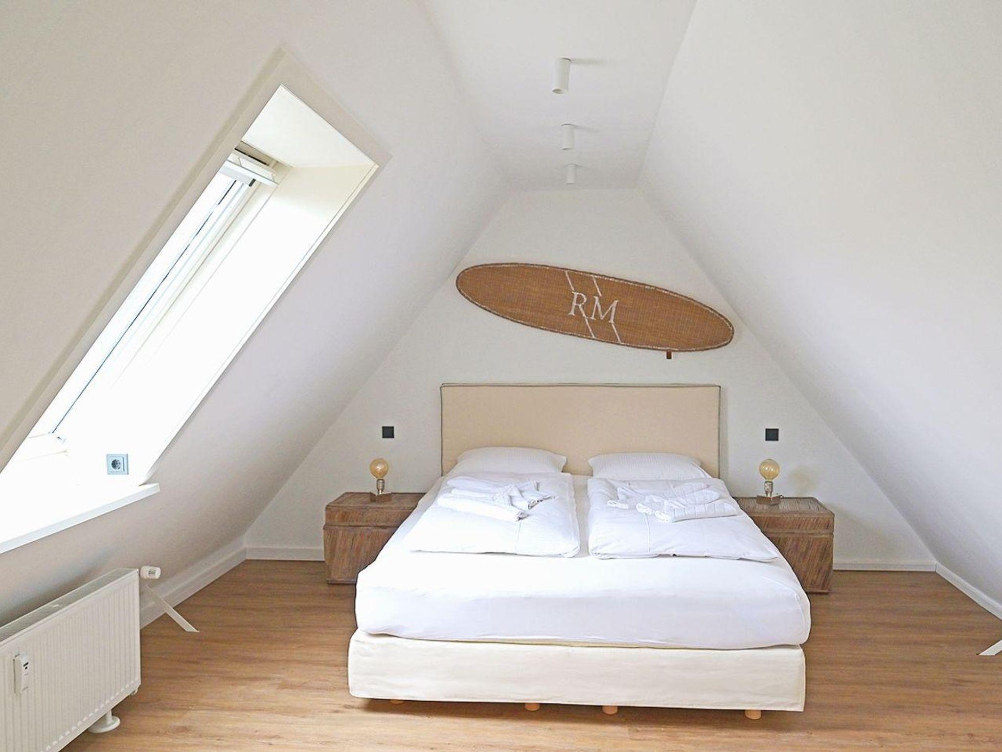 Über eine charmante Holztreppe gelangen Sie in das gemütliche Schlafzimmer mit einem Kingsize-Bett (180x200) und schrägen Dachfenstern, die eine behagliche Atmosphäre schaffen.