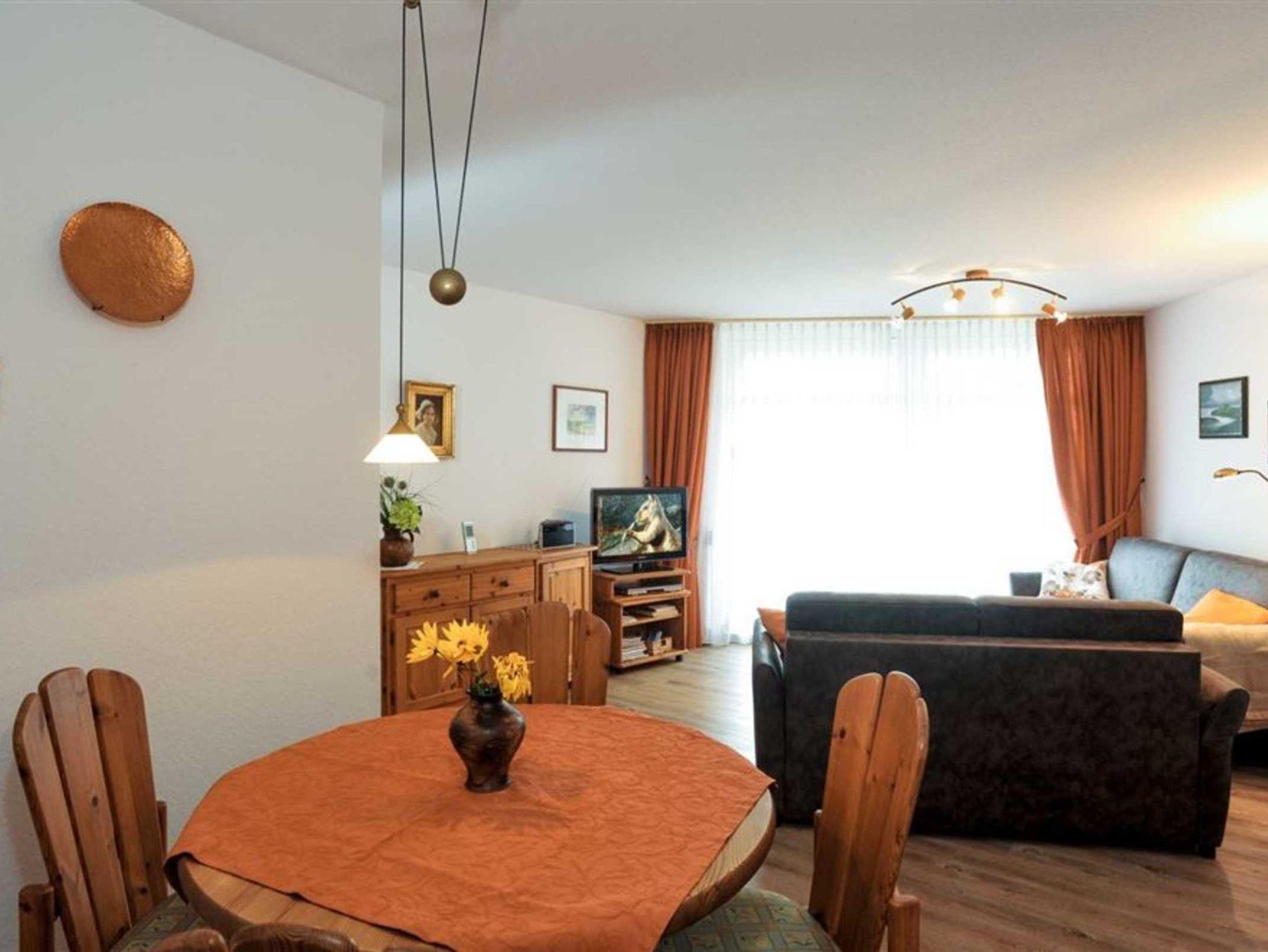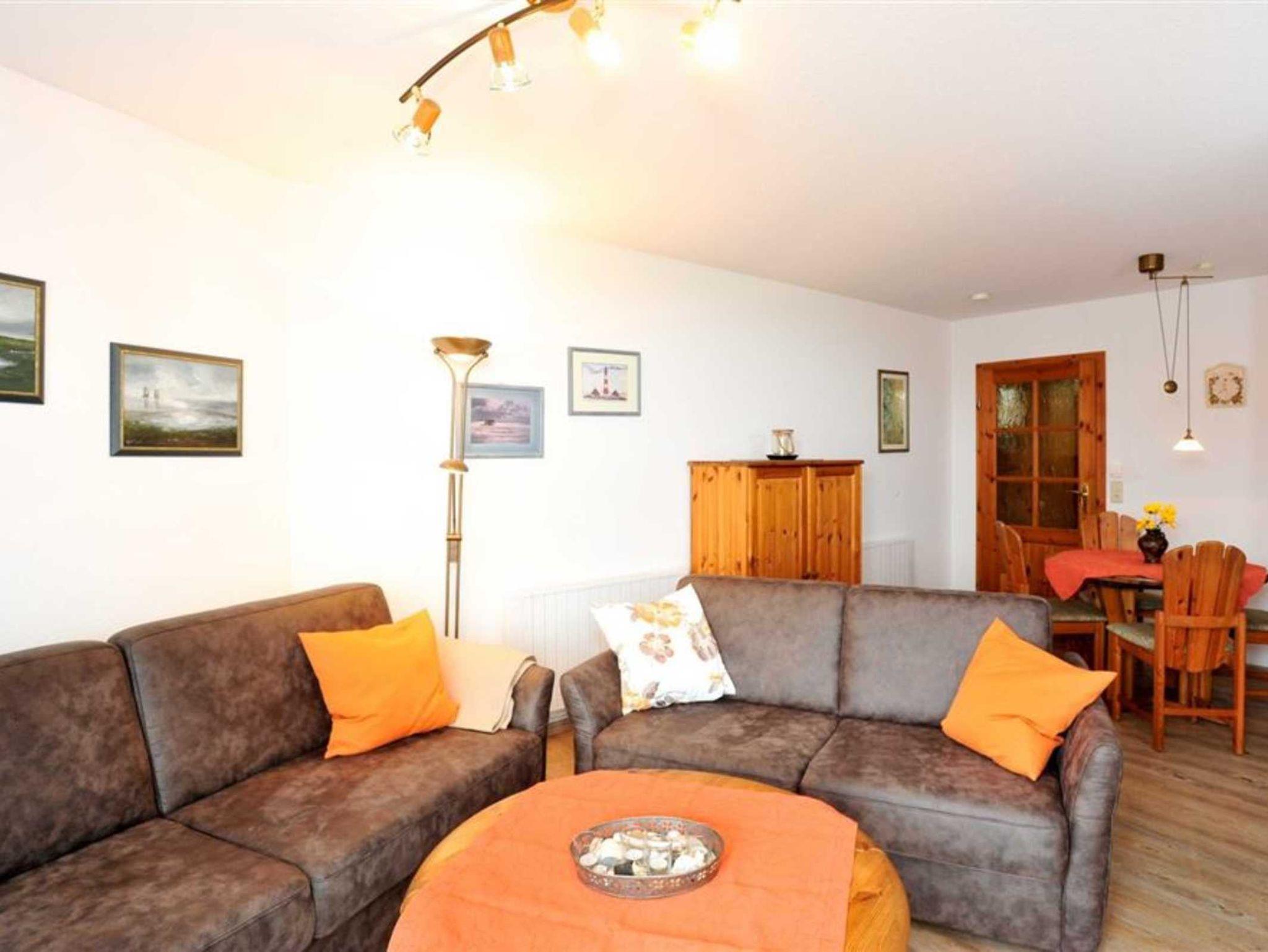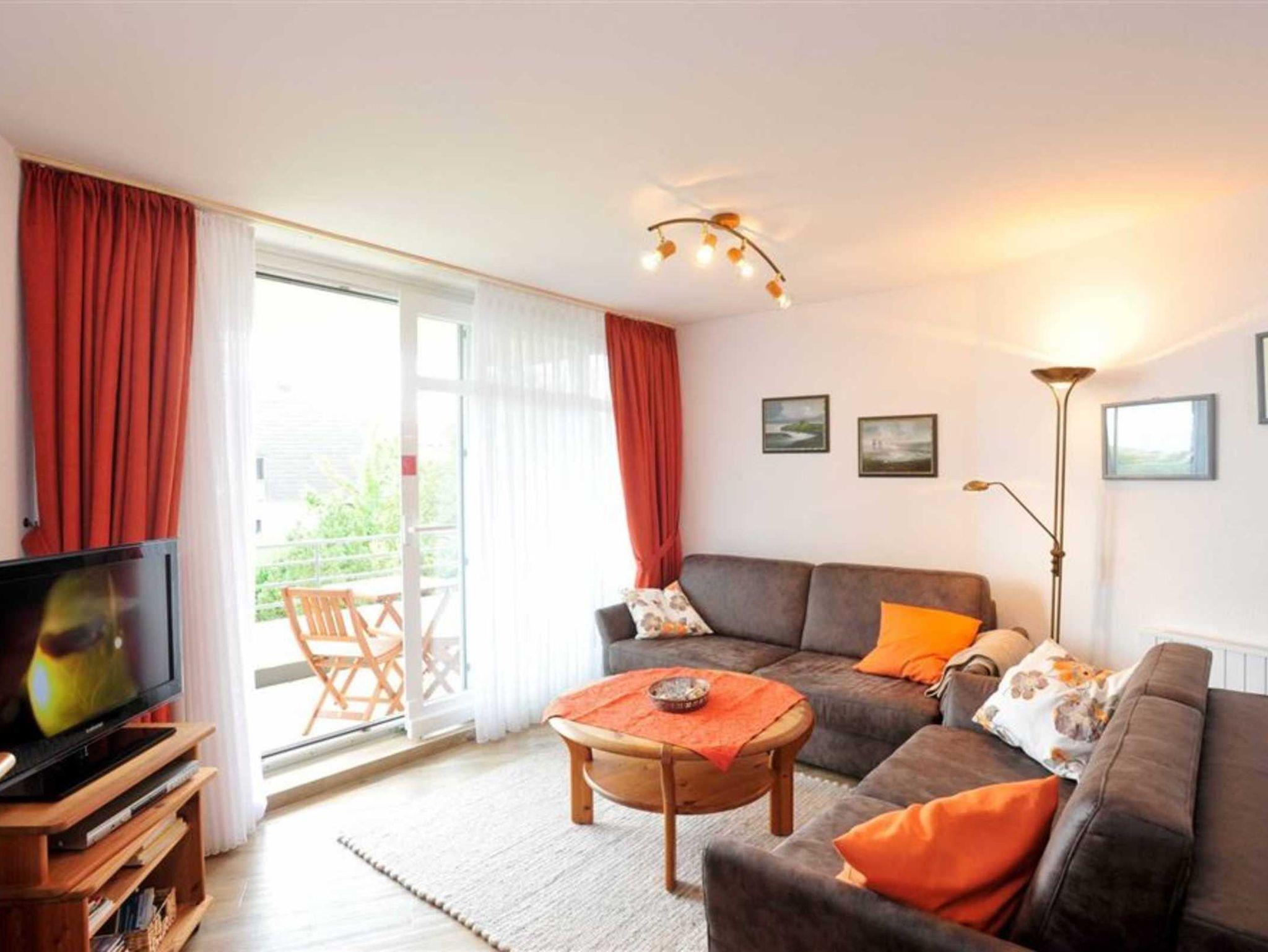Wohnzimmer mit einem 3er-Sofa und einem ausziehbaren (Schlaf-) Sofa (130x190cm), Esstisch mit 4 Stühlen, TV (Kabel) und DVD-Player. Direkter Zugang zum möblierten Balkon mit Meerblick.