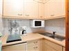 Kleine halboffene Küche mit Herd mit 2 Kochstellen, Mikrowelle, Kühlschrank mit Gefrierfach und einigem Komfort.