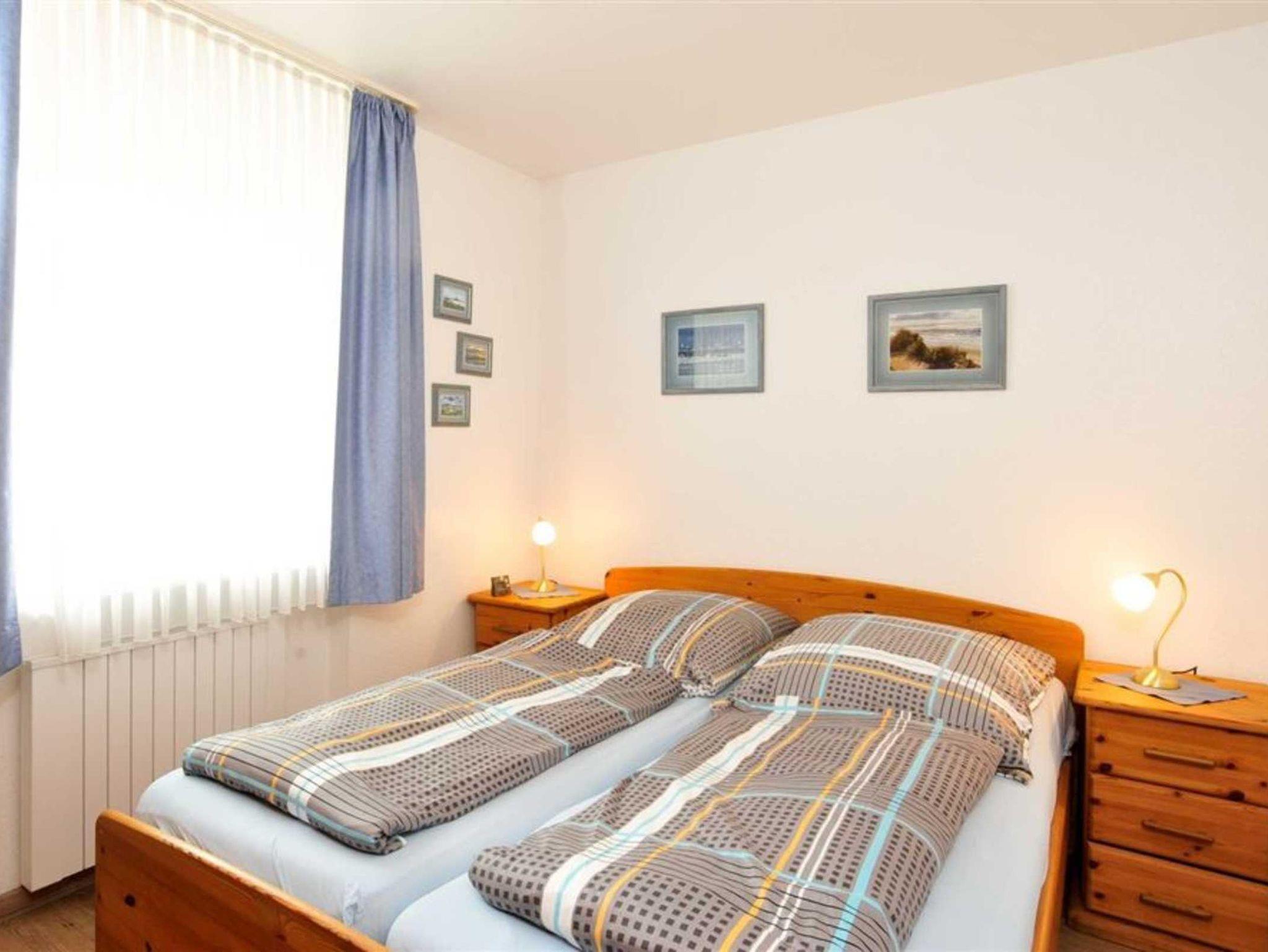 Schlafzimmer mit Doppelbett (2x 80x200cm), elektrischer Heizung und Kleiderschrank.