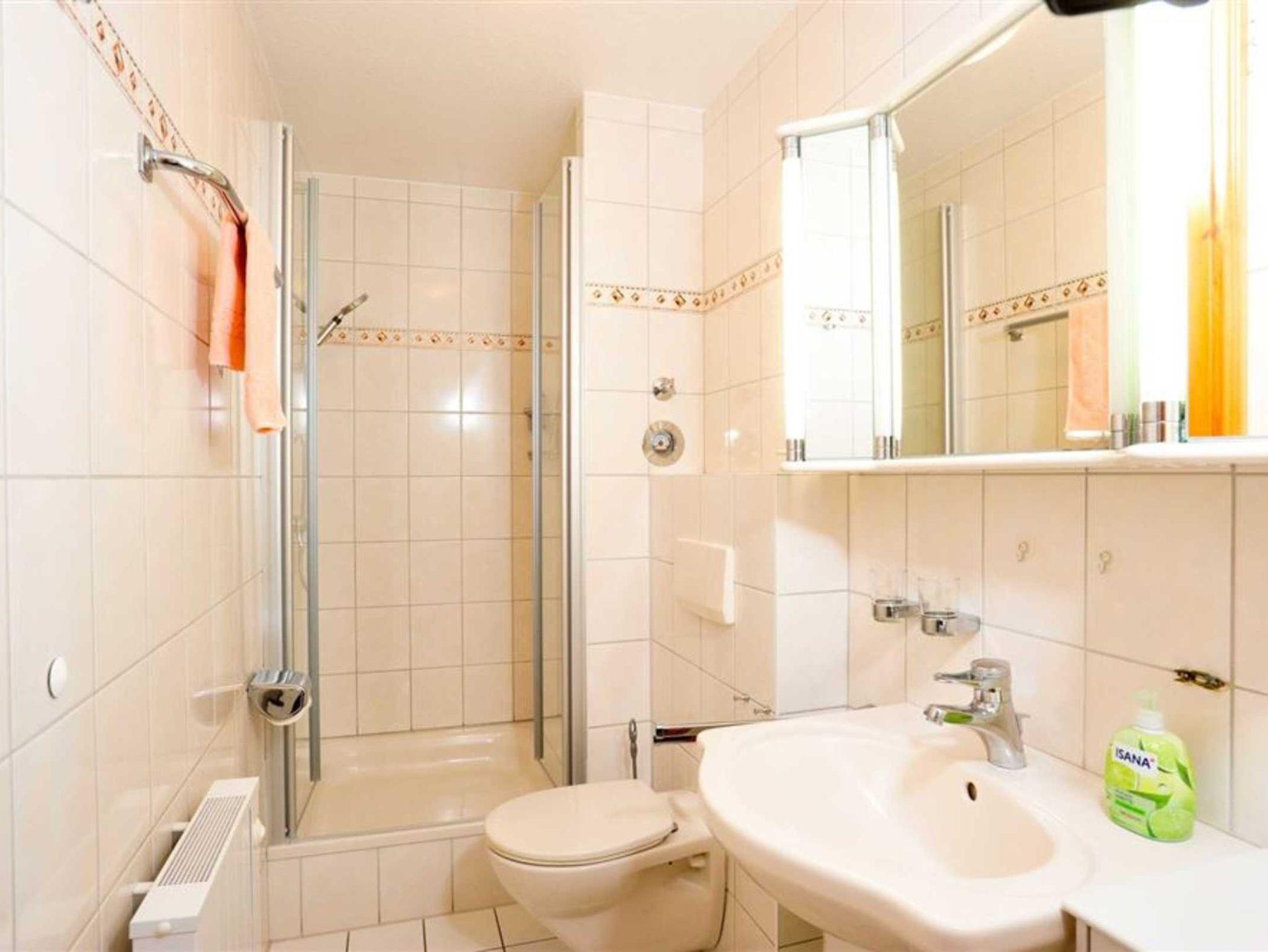 Badezimmer (Duschbad) mit Dusche, WC und Föhn.