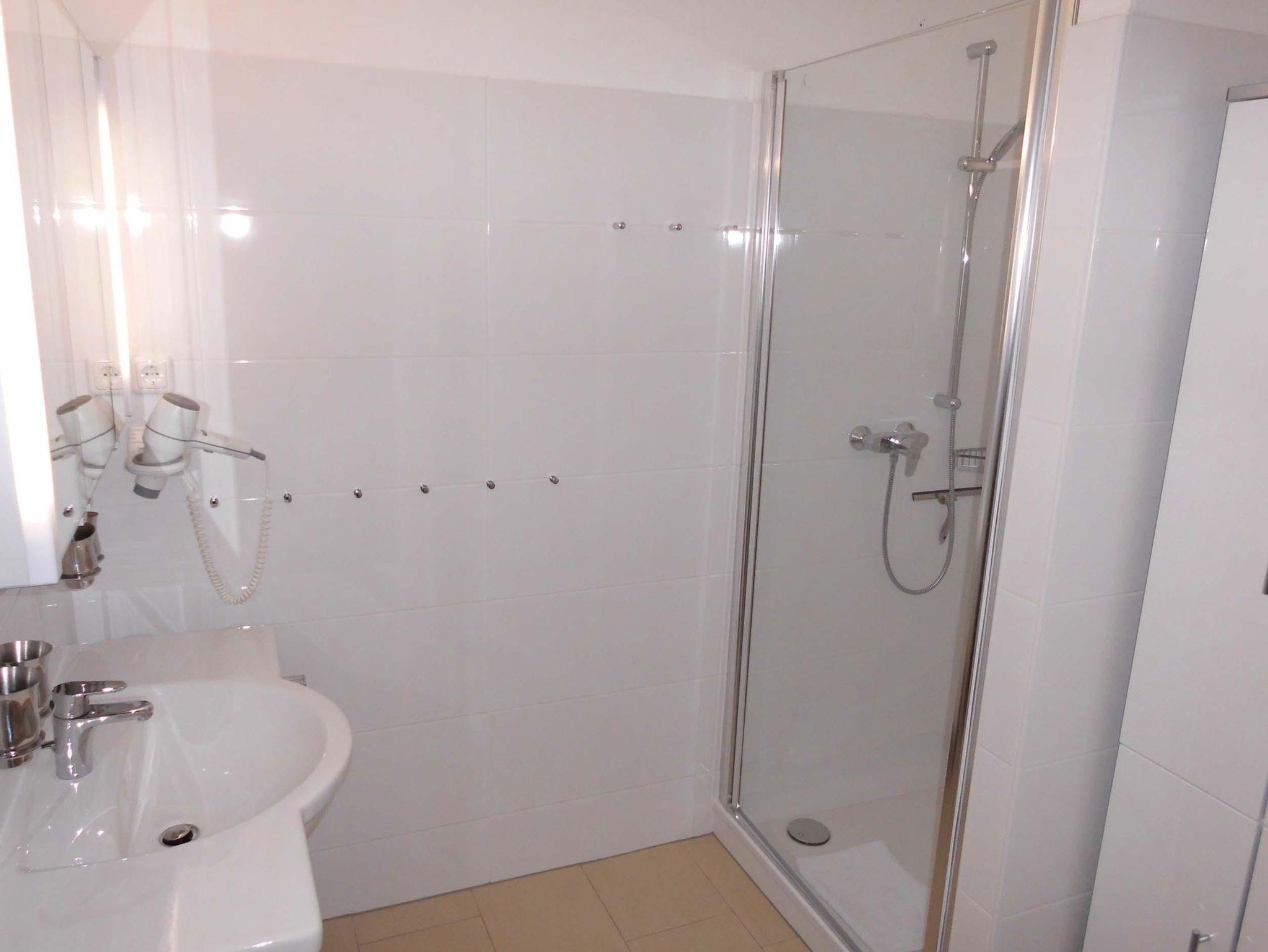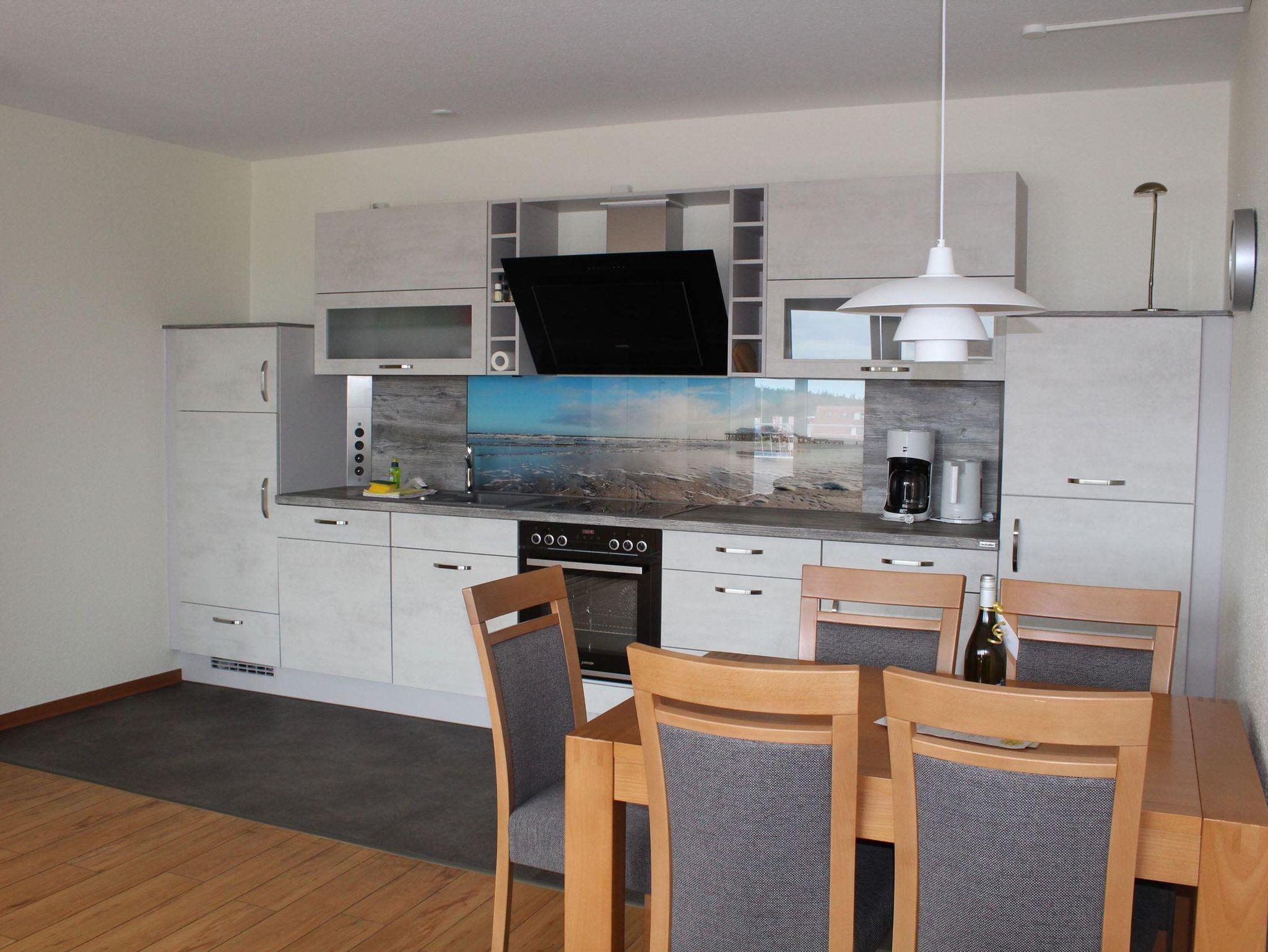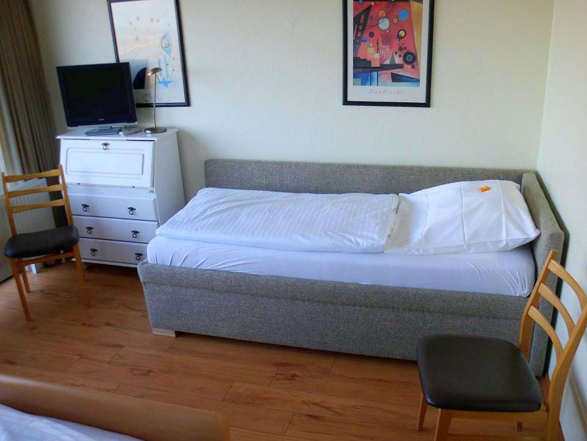 App.Nr. 70, Typ 6a, IV.OG., Nord-Westlage Schlafraum mit Doppelbett (1,60 m breit) und Einzelbett, Wohn/Schlafraum mit 2 Wandschrankbetten, Laminatfußboden, Sitzecke, Essecke, Küchenzeile mit Geschirrspüler und Backofen, Dusche/WC, 2 x Kabel-TV, Durchwahltelefon, Balkon, Garagenstellplatz-Nr.70, Aufzug und Fahrradkeller, Rezeption, Brötchenservice, Schwimmbad, Sauna kostenpflichtig, kostenfreier Internetzugang (LAN1-Germania). Bettwäsche wird einmalig bei Einzug gestellt. Handtücher können gegen Gebühr entliehen werden. NICHTRAUCHERWOHNUNG