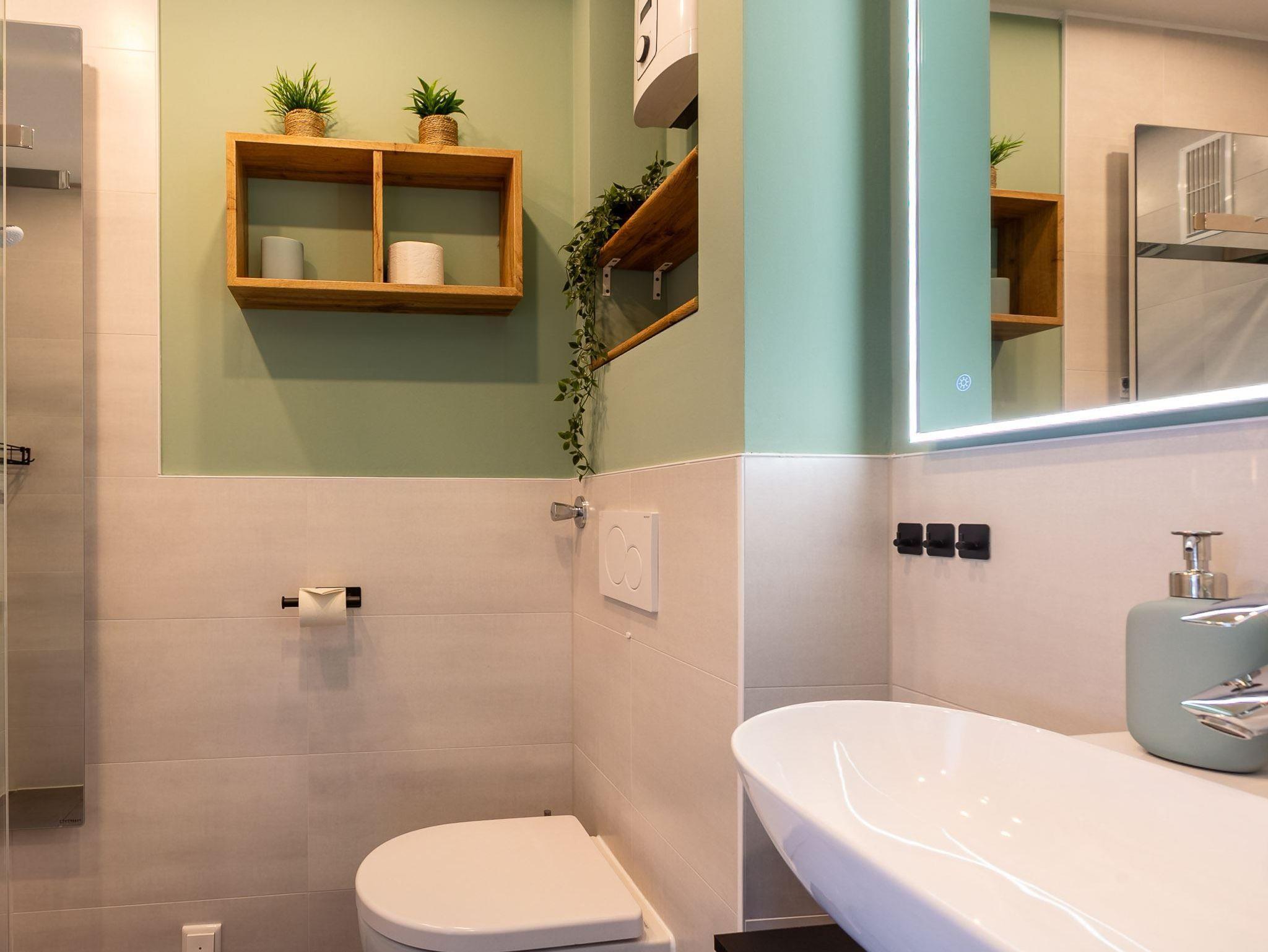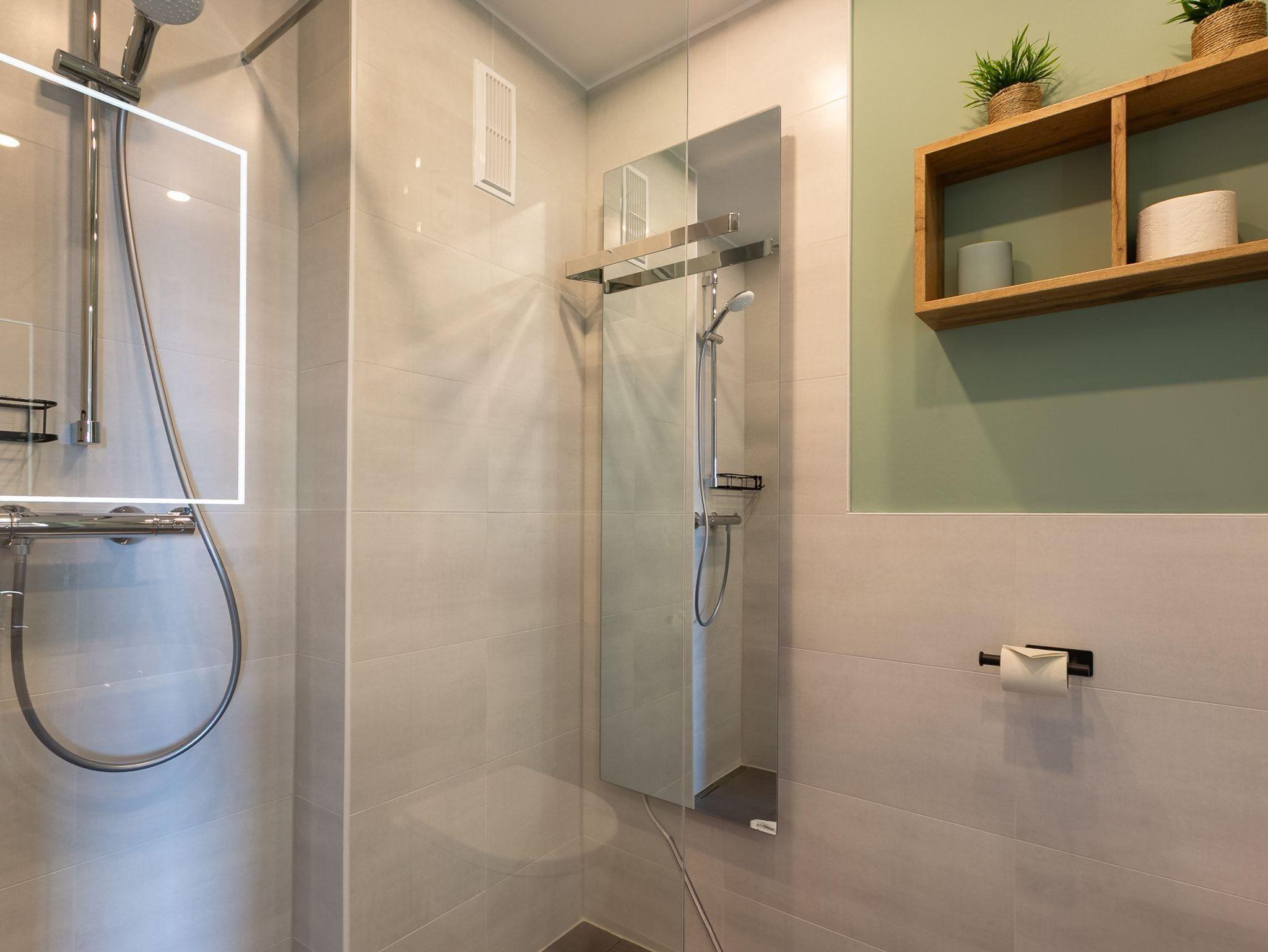 Badezimmer (Duschbad) mit Dusche (niedriger Eintritt), WC, beheizbarem Ganzkörperspiegel und Handtuchwärmer.