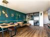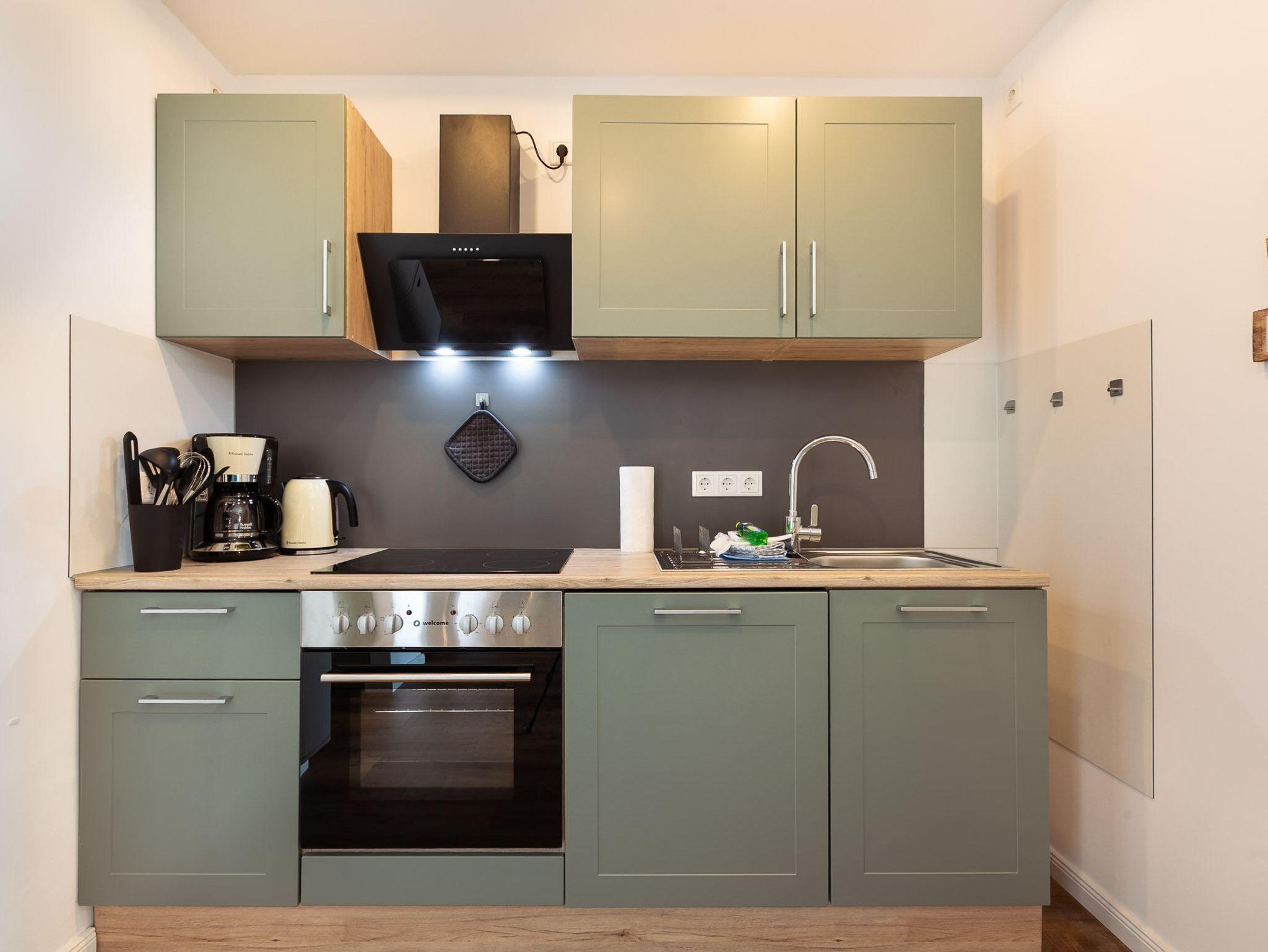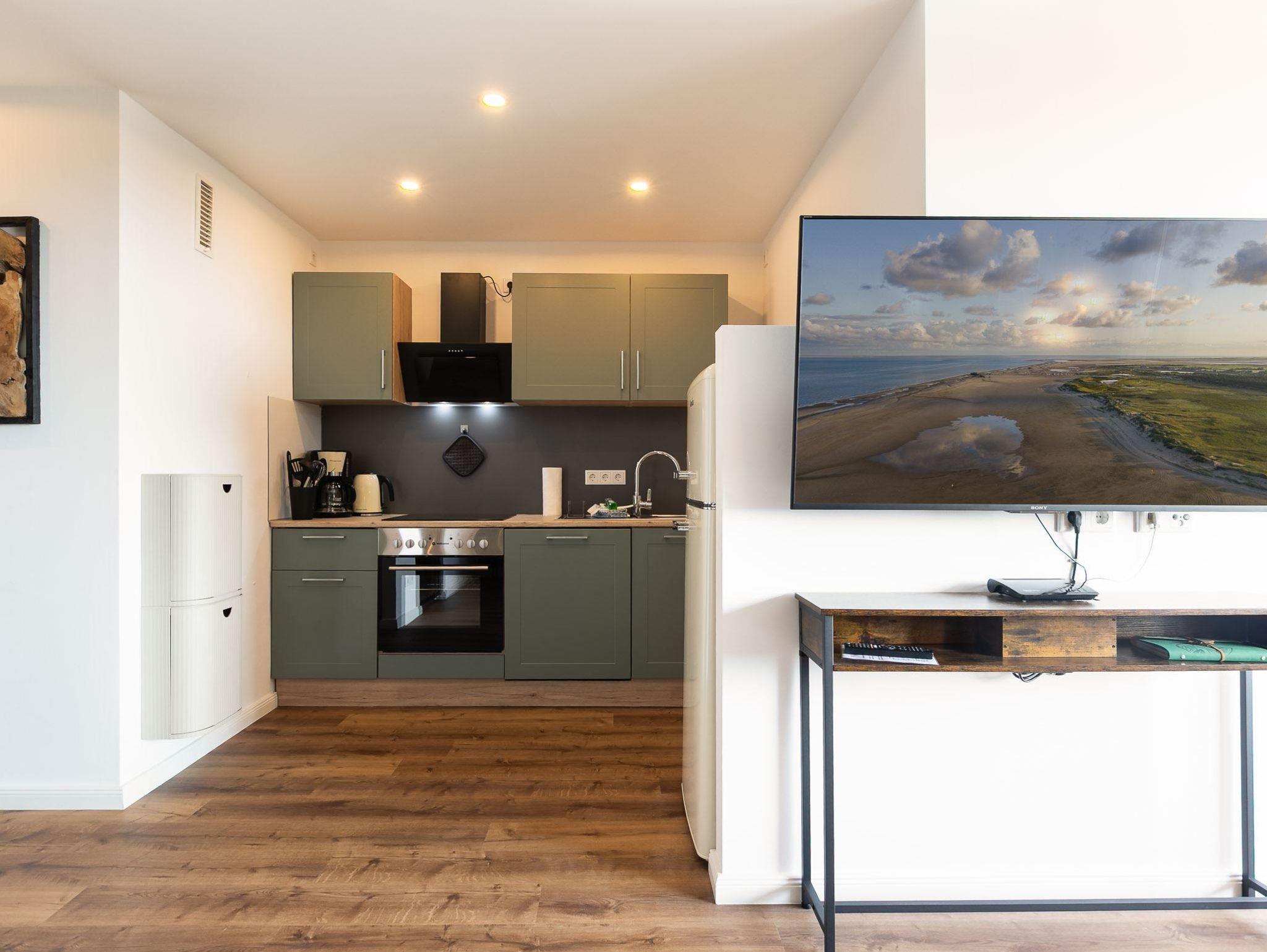 Wohnzimmer mit Ledersofa und Fußhocker, Smart-TV (Sat) und Esstisch mit 2 Stühlen und Sitzbank. Die großzügige Bank ist nicht nur eine Sitzmöglichkeit am Tisch, man kann hier auch wunderbar die Füße hochlegen und Kaffee mit Meerblick genießen. Direkter Zugang zum möblierten Balkon nach Südwesten. Offene Küche mit Backofen, Geschirrspüler und Kühl-Gefrier-Kombi.