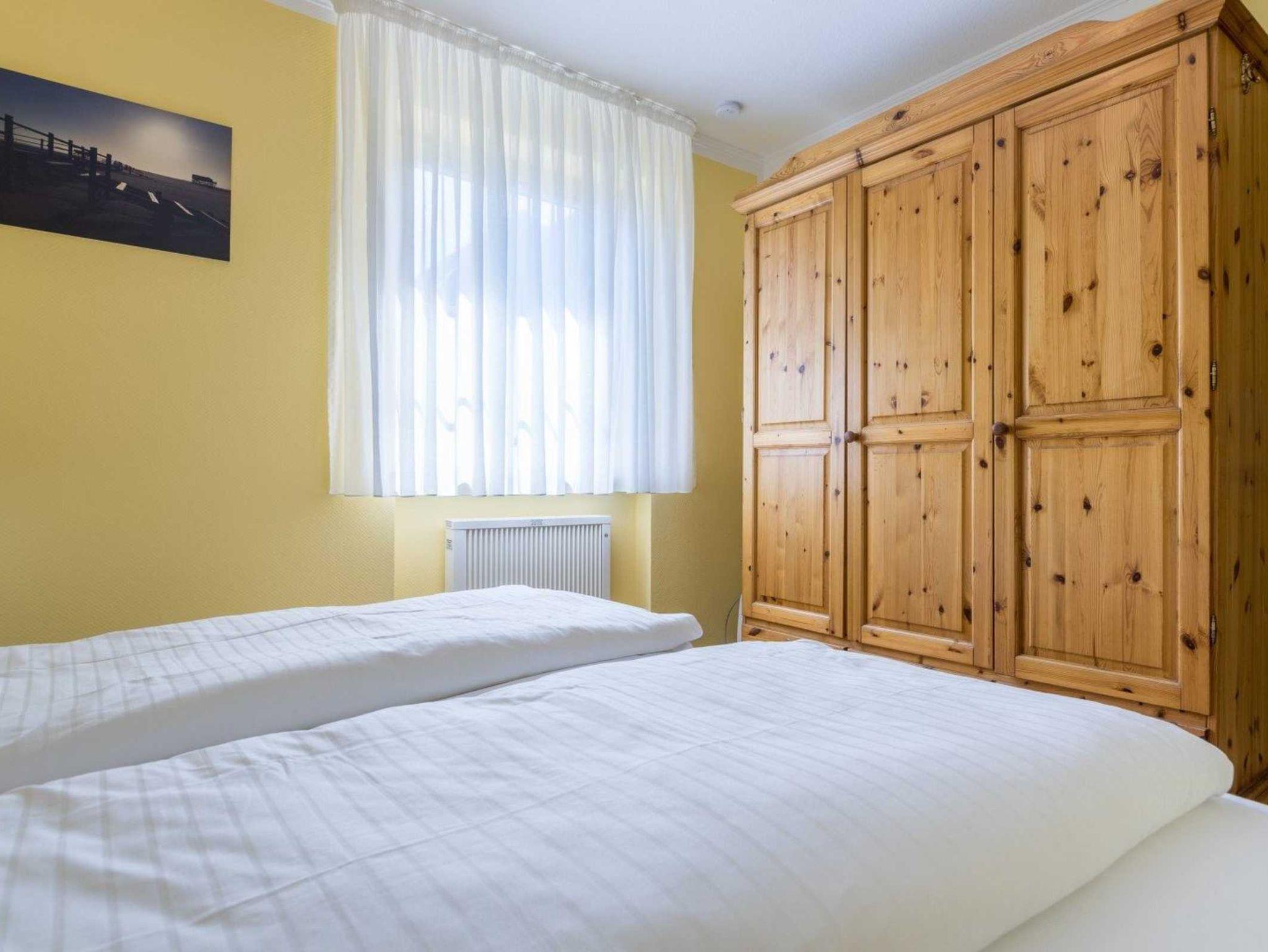Schlafzimmer mit Doppelbett (2x 90x200cm), Kleiderschrank und Radiowecker.