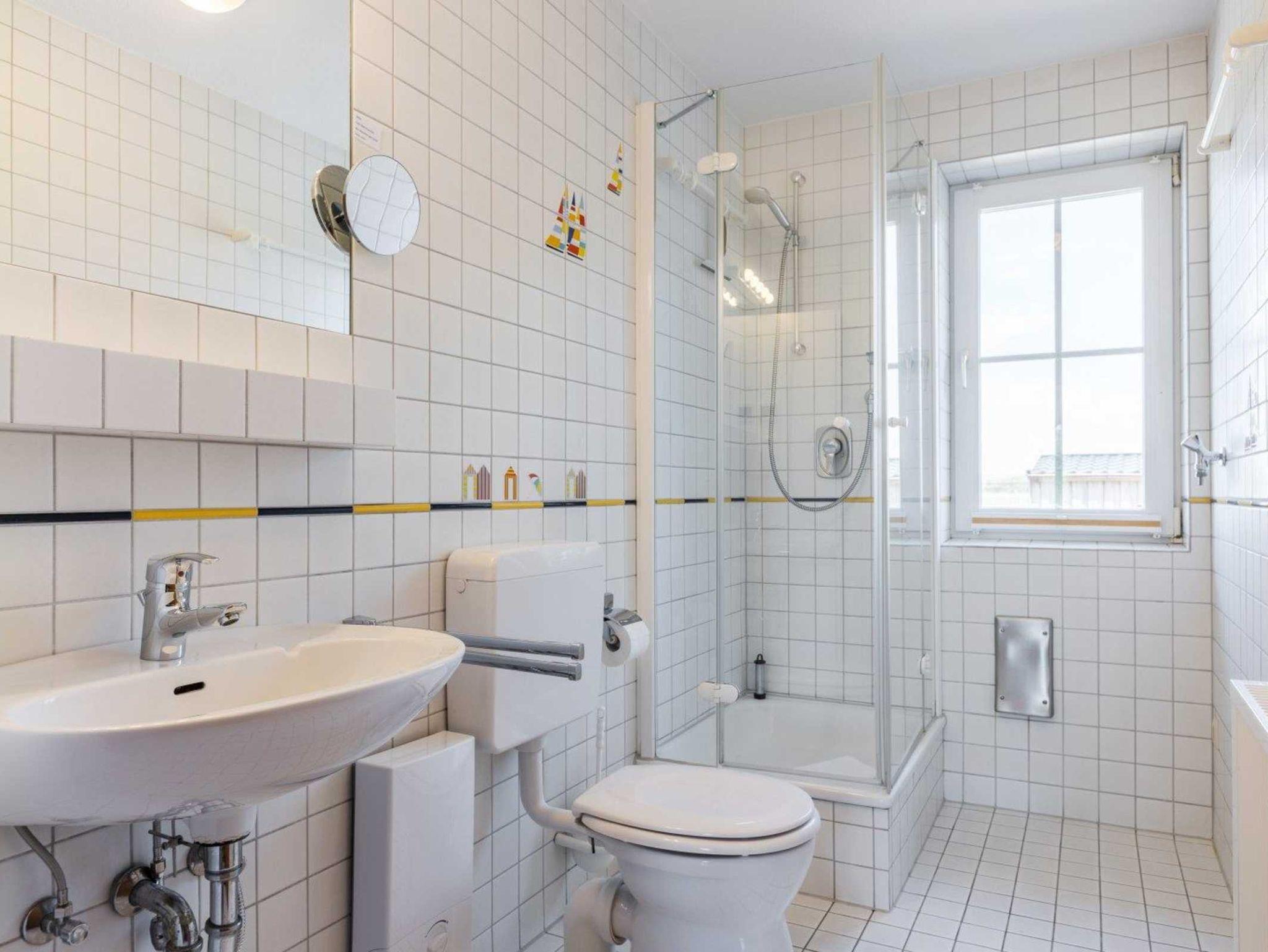 Badezimmer (Duschbad) mit Dusche, WC, Kosmetikspiegel, Föhn und Tageslicht.