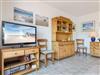 Wohnzimmer mit Schlafsofa (150x190cm), 2 Sesseln, Esstisch mit 4 Stühlen, TV (Sat) mit Radioempfang und BluRay-Player. Direkter Zugang zur möblierten Gartenterrasse nach Westen mit Sonnenmarkise. Offene Küche mit Backofen, Kühlschrank mit Gefrierfach und Mikrowelle.