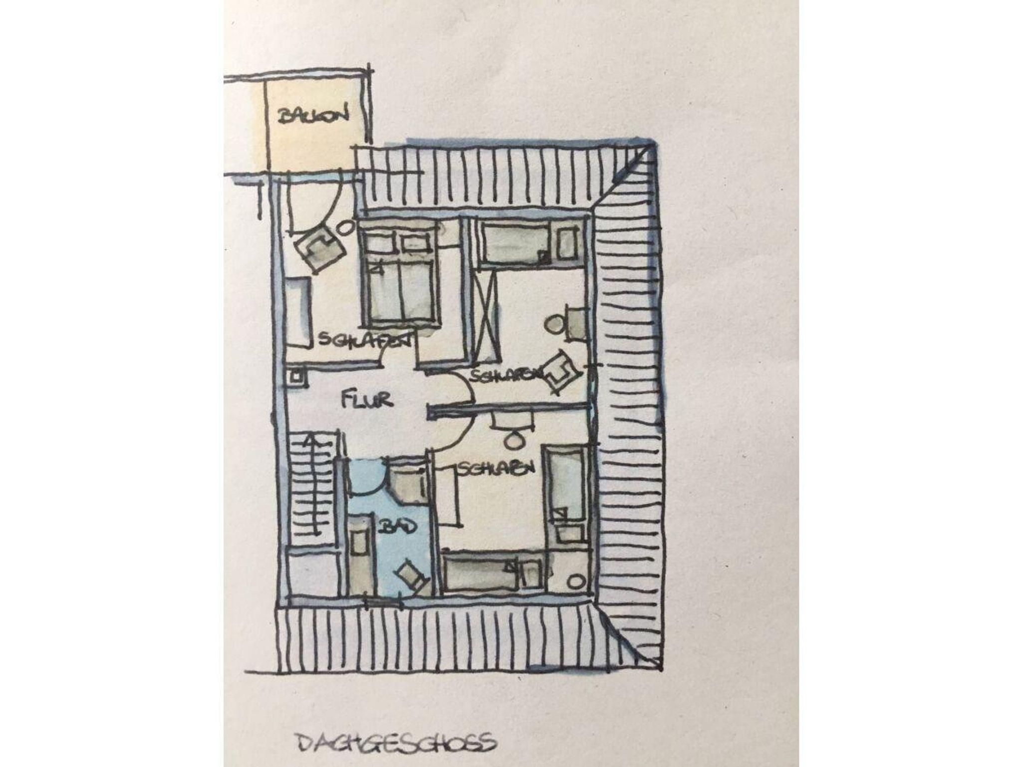 Das Obergeschoss ist mit 3 Schlafräumen - 1 Schlafraum mit einem Doppelbett - 1 Schlafraum mit 2 Einzelbetten - 1 Schlafraum mit einem Einzelbett , ausgestattet.