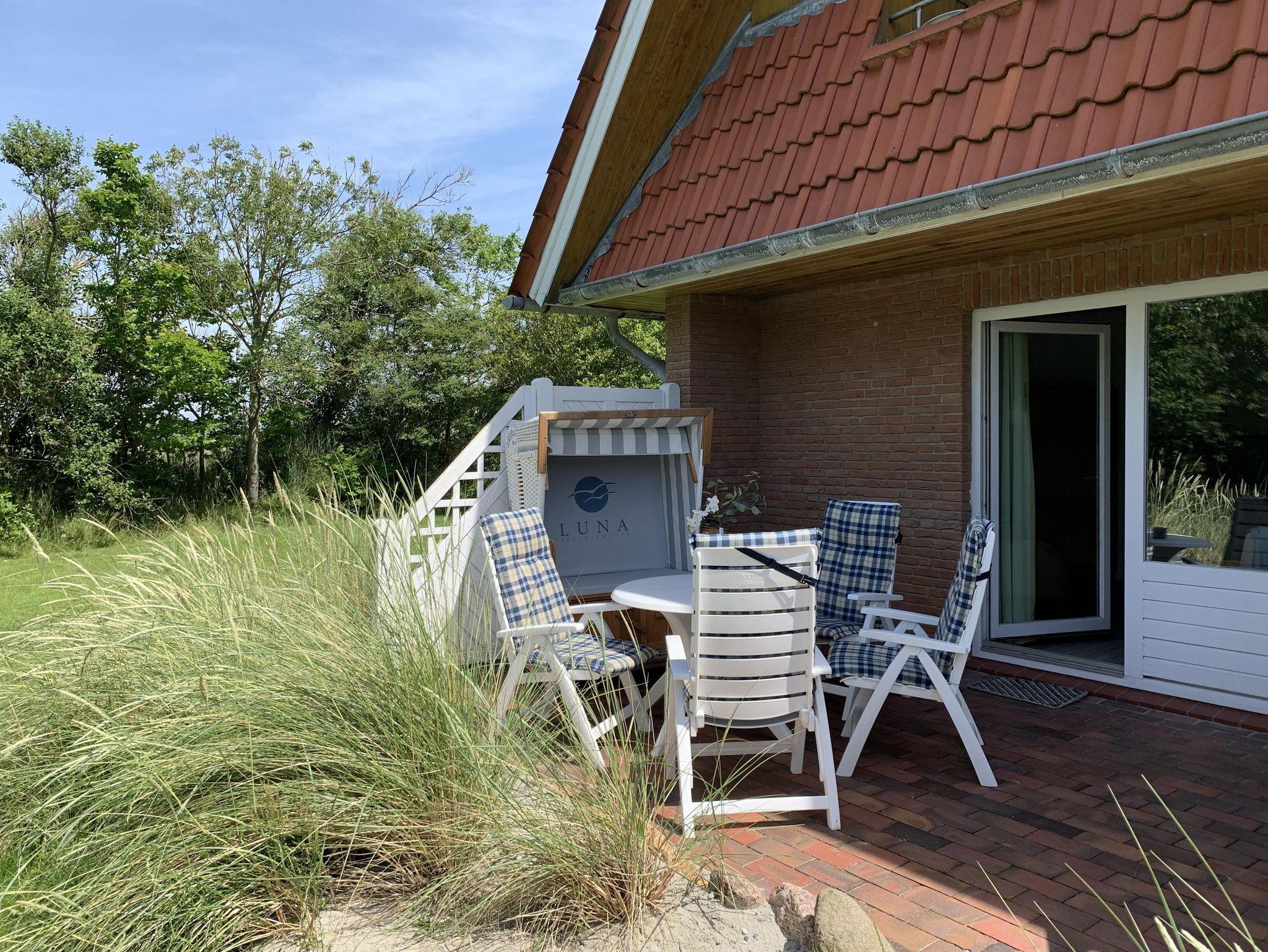 Das über 10.000 qm große Appartementhausgrundstück, eingerahmt von alten, landtypischen Bäumen ist parkähnlich mit Liegewiesen für unsere Gäste angelegt. Ein kurzer Weg, ca 100m, und Sie sind bereits im Dünengelände und am Strand.