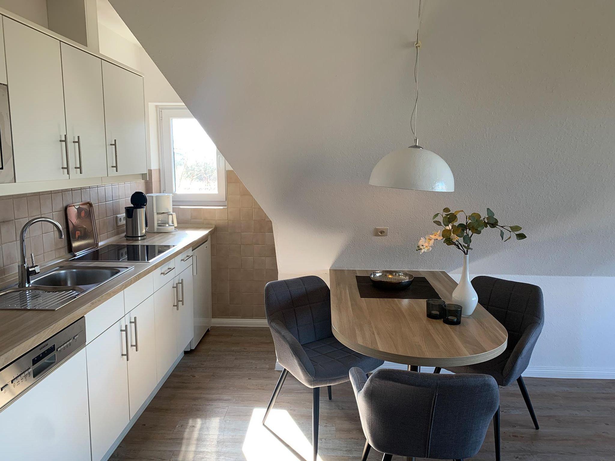 • komplett eingerichtete Küche mit Ceranfeld, Mikrowelle, Geschirrspüler, Kühlschrank mit Gefrierfach, Wasserkocher, Kaffeemaschine (Filter), Toaster.