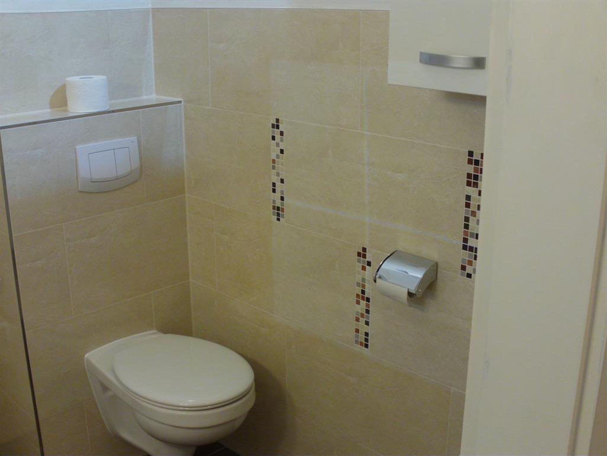 Das Duschbad mit WC ist ausreichend groß und hat eine hohe Deckenhöhe.