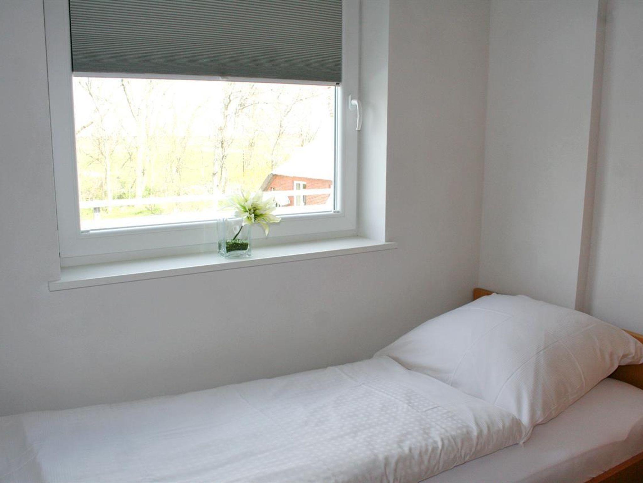 Eingangsbereich mit Garderobe, offene Küche zum Wohnraum mit Essbereich in einem vorgelagerten Wintergarten, direkter Zugang zur Terrasse und Garten, Schlafzimmer mit 2 Einzelbetten (90x200cm), 1 Duschbad mit WC und Waschbecken. Parkplatz und Fahrradständer sind vorhanden.