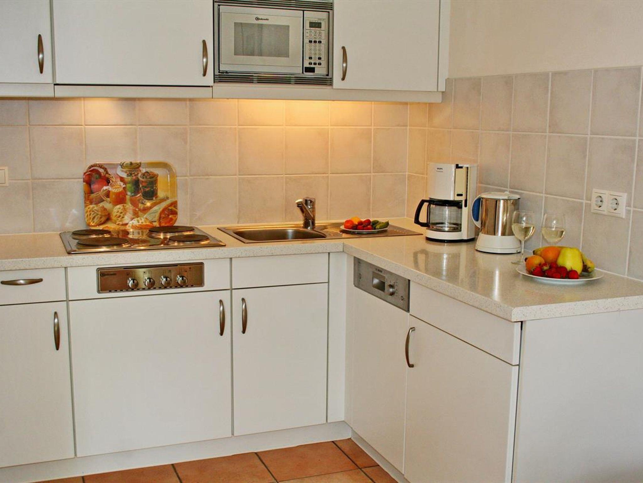 • komplett eingerichtete Küche, Mikrowelle, Geschirrspüler, Kühlschrank mit Gefrierfach, Wasserkocher, Kaffeemaschine (Filter), Toaster.