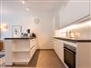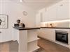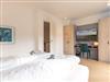 Wohnzimmer mit hochwertigem Schlafsofa (160x200 cm, mit Matratze), Sesseln, großem SMART-TV und Esstisch. Offene Küche mit Backofen, Mikrowelle, Geschirrspüler, Kühl-Gefrierkombination, Nespresso-Maschine und Wasch-Trockner. Zugang zur möblierten Südterrasse mit zwei Sonnenliegen und Garten.