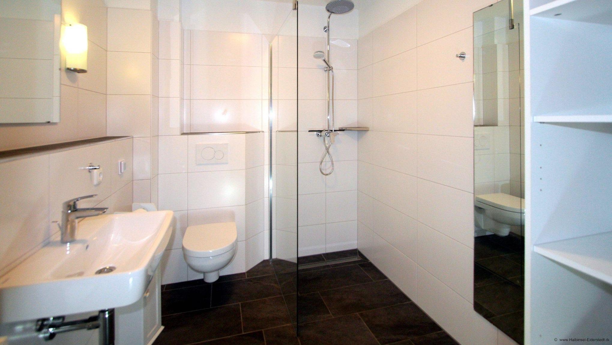 Im großen und modernen Badezimmer mit Fußbodenheizung sind Walk-in-Dusche, WC, Spiegel und großzügige Ablageflächen vorhanden. Daran schließt sich die finnische Sauna an.