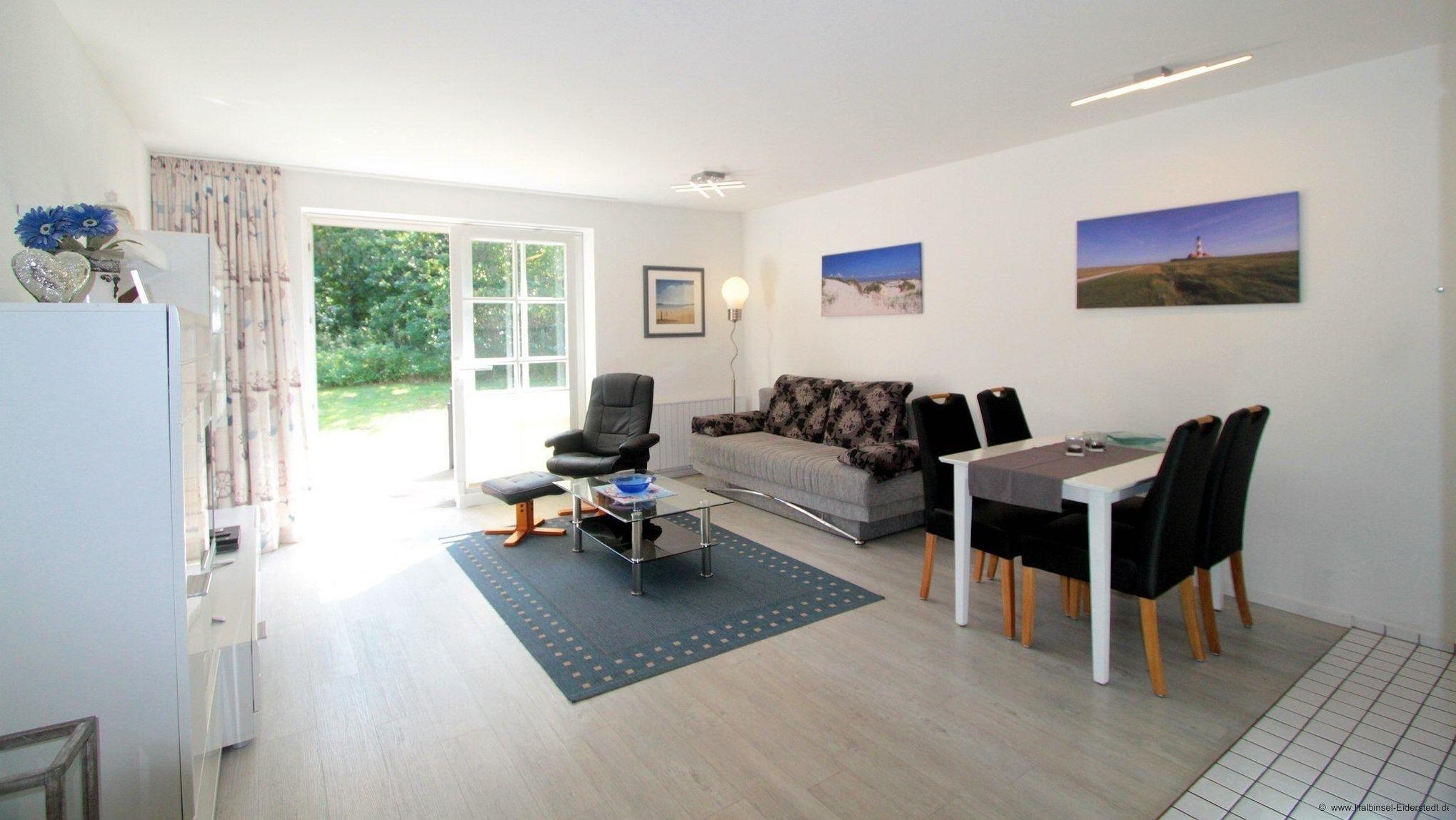 Im schönen Wohnzimmer stehen (Schlaf-)Sofa, Esstisch, Sessel und TV zur Verfügung. Die Küchenzeile ist in das Wohnzimmer integriert. Die moderne Küchenzeile ist mit Kaffeemaschine, Spülmaschine und Backofen ausgestattet, so dass eine bequeme Eigenversorgung gewährleistet ist.