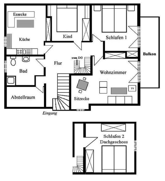 Das helle Wohnzimmer mit Zugang zum Balkon ist ausgestattet mit einer Sitzgarnitur und einer zusätzlichen Essecke, Flachbildschirm, SAT-TV, DVD Recorder und einer Stereoanlage. Die Wohnküche mit Essplatz ist mit Spülmaschine, 4 Platten-Cerankochfeld, Backofen, Mikrowelle, Kühlschrank, Kaffeemaschine und anderen Kleingeräten und allem was in der Küche benötigt wird ausgestattet. Zum Schlafen stehen zwei separate Schlafzimmer und ein innenliegendes Kleinkinderzimmer zur Verfügung. Ein Schlafzimmer hat direkten Zugang zum Balkon, das zweite Schlafzimmer befindet sich im Dachgeschoss und ist mit einem Flachbildschirm mit SAT-TV und DVD ausgestattet. Im großzügigen Duschbad kann die Waschmaschine kostenlos benutzt werden.