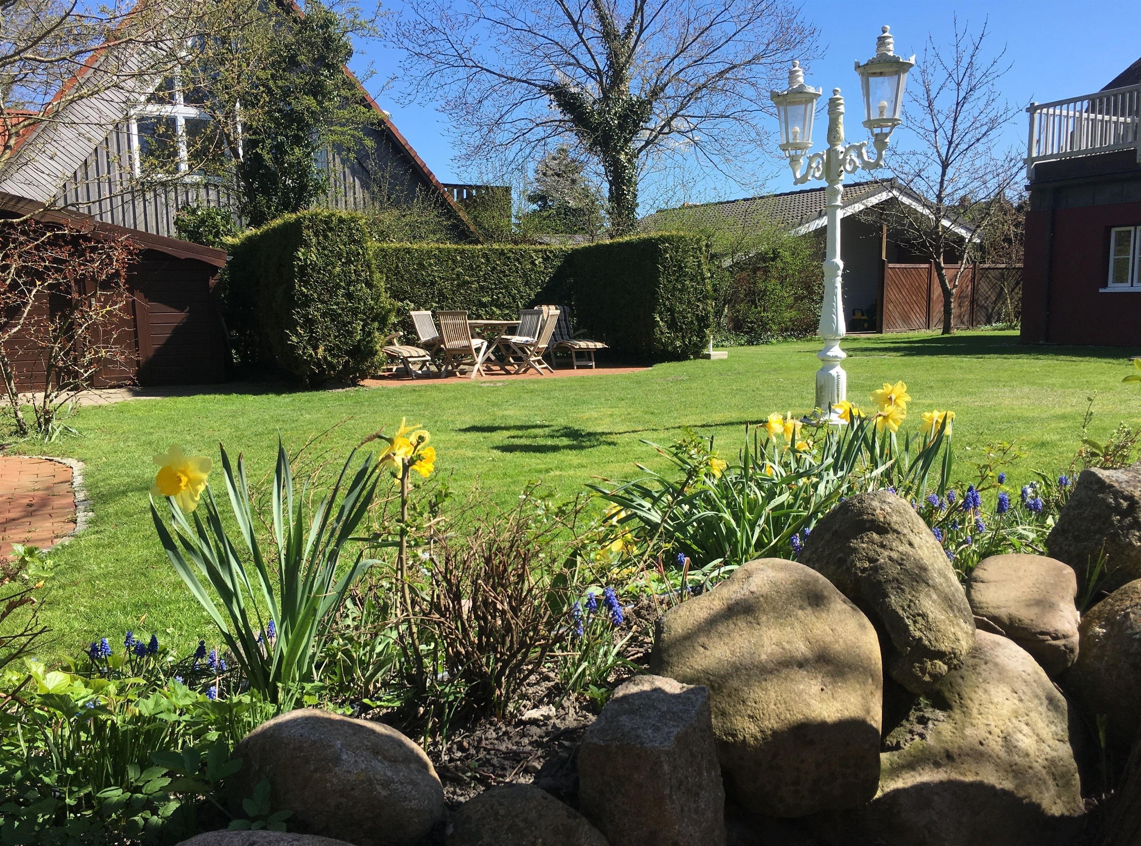riesiges eingewachsenes Gartengrundstück mit Liegen und Deckchairs auf den Sonnenterrassen, Obstbäumen, Friesenwall und Teich, Parplatz auf dem Grundstück