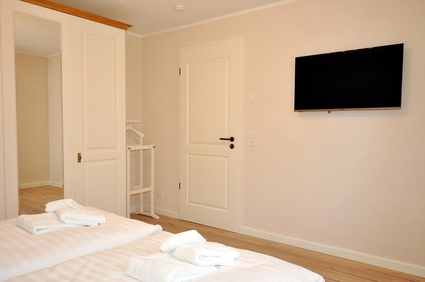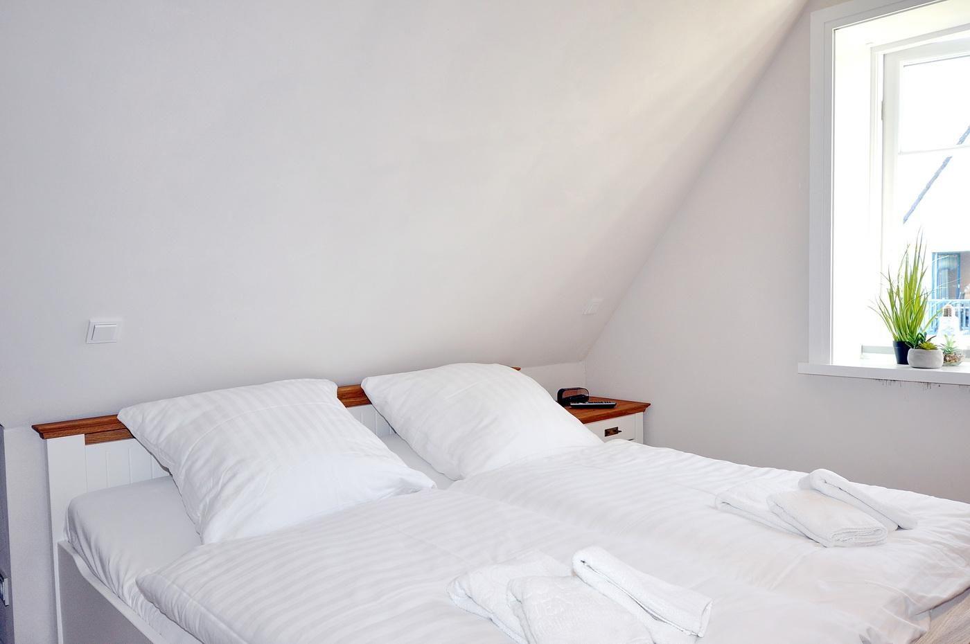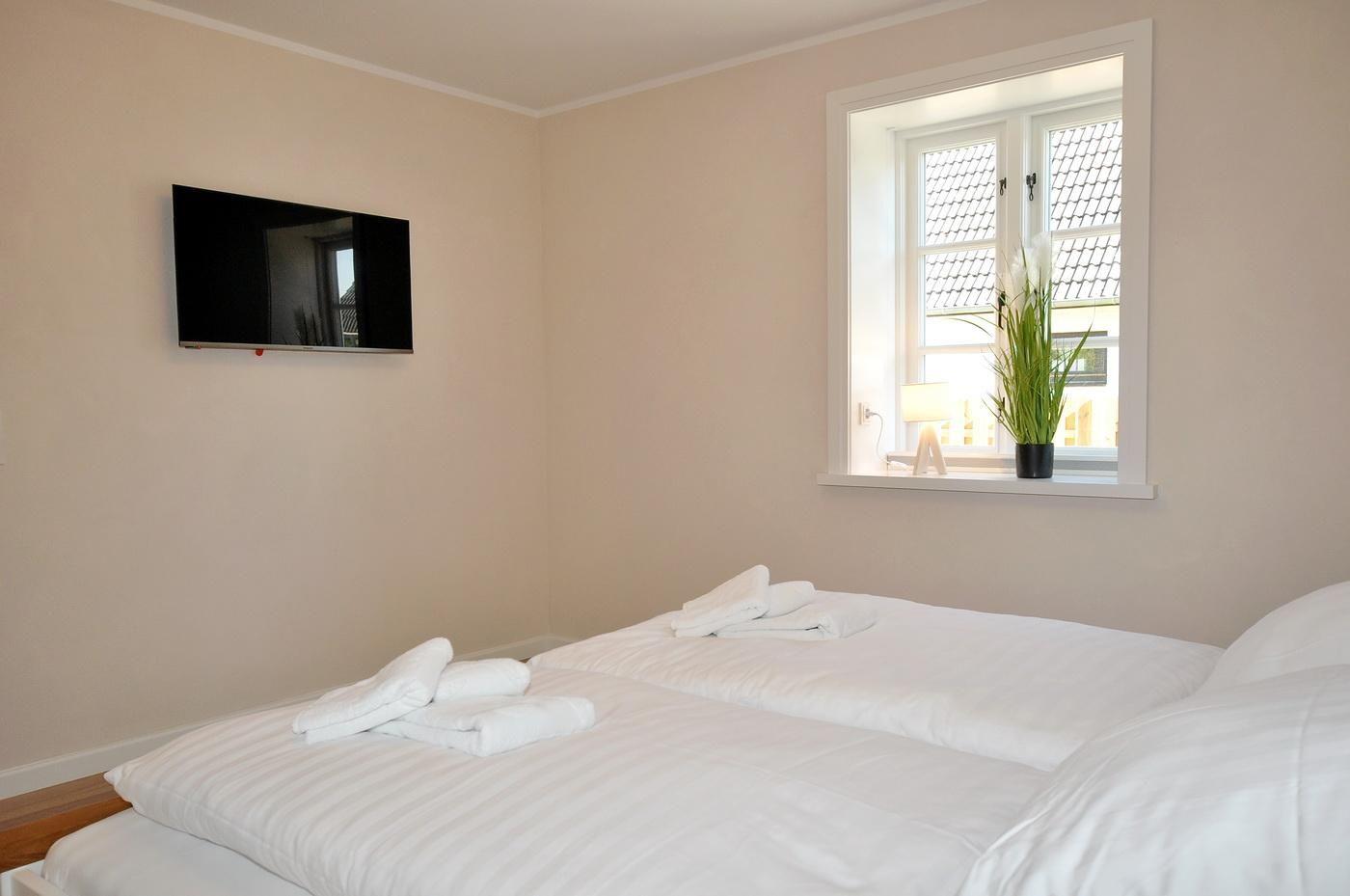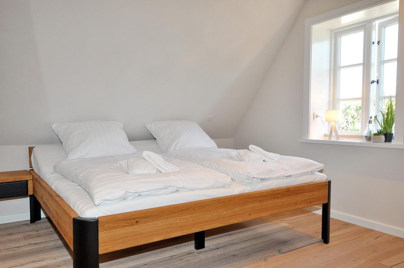Obergeschoss: ein Schlafzimmer mit Doppelbett (200 x 200 cm - Einzelmatratzen), TV und Duschbad/ WC en suite, ein Schlafzimmer mit Doppelbett (180 x 200 cm - Einzelmatratzen), TV und innenliegendem Duschbad/ WC en suite, ein Schlafzimmer mit Einzelbett (90 x 200 cm)