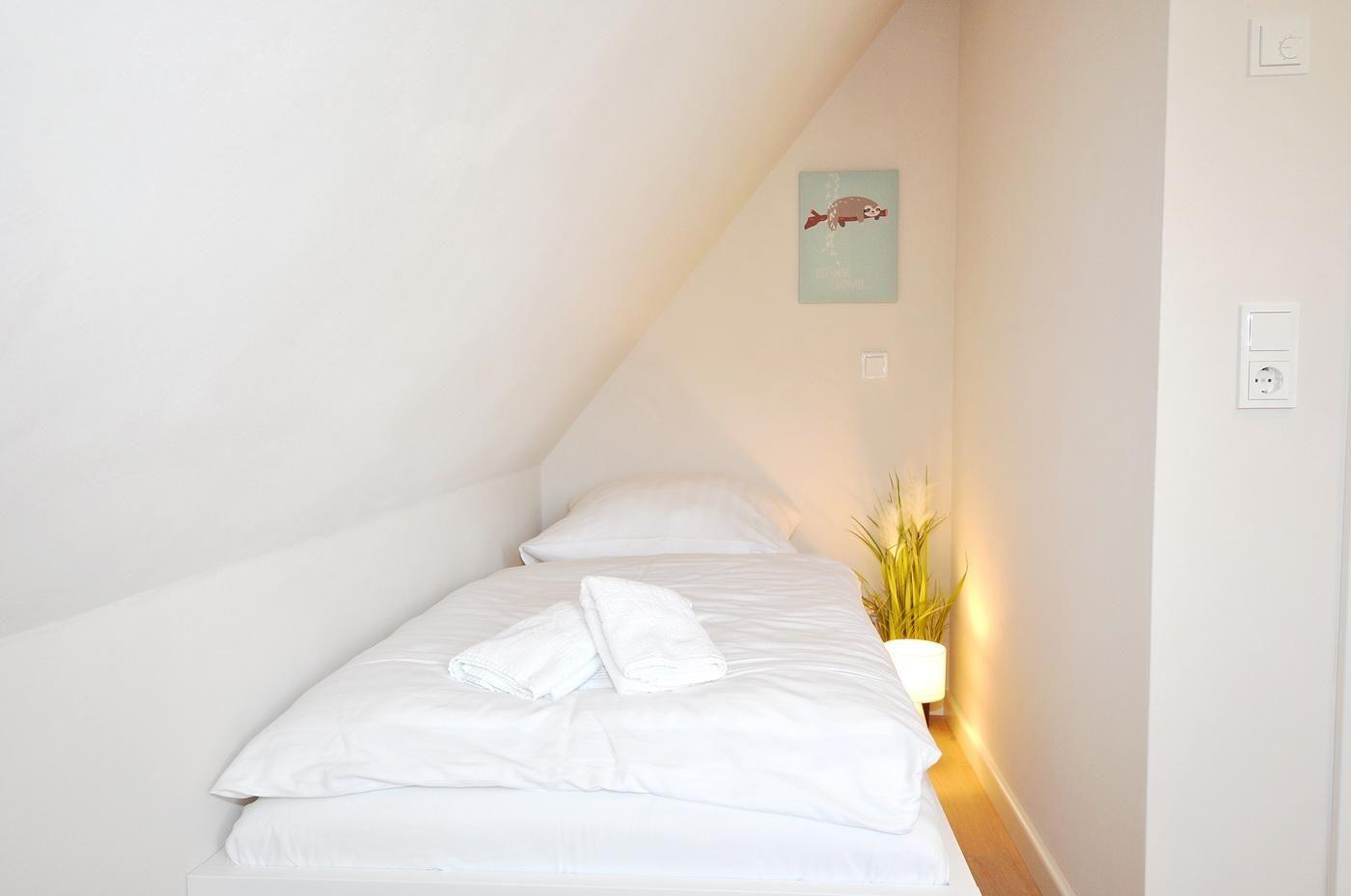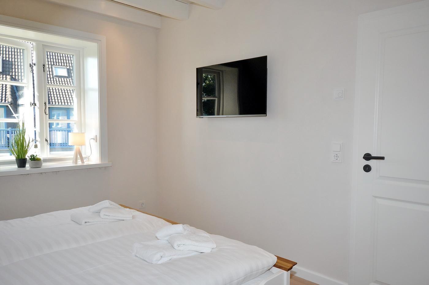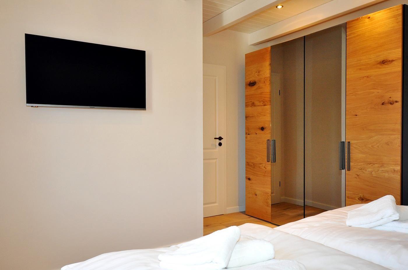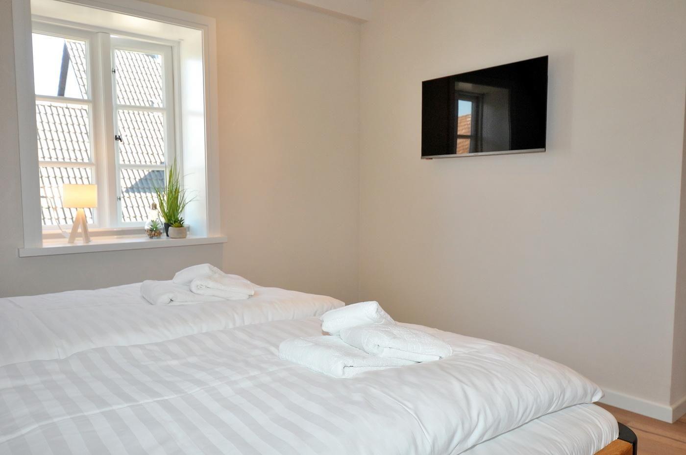 Obergeschoss: ein Schlafzimmer mit Doppelbett (200 x 200 cm - Einzelmatratzen), TV und Duschbad/ WC en suite, ein Schlafzimmer mit Doppelbett (180 x 200 cm - Einzelmatratzen), TV und innenliegendem Duschbad/ WC en suite, ein Schlafzimmer mit Einzelbett (90 x 200 cm)