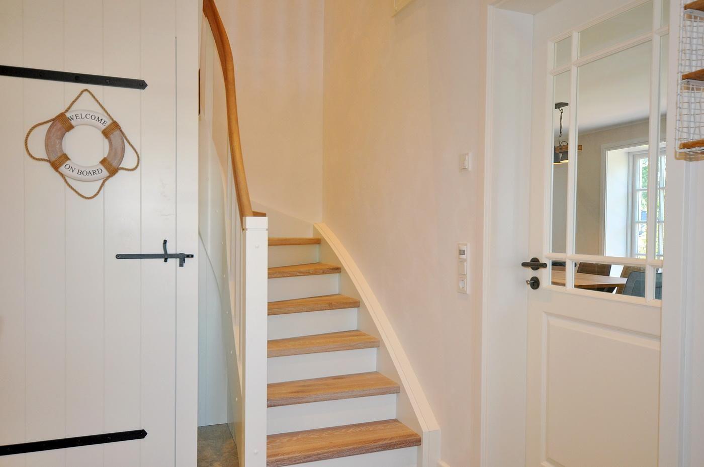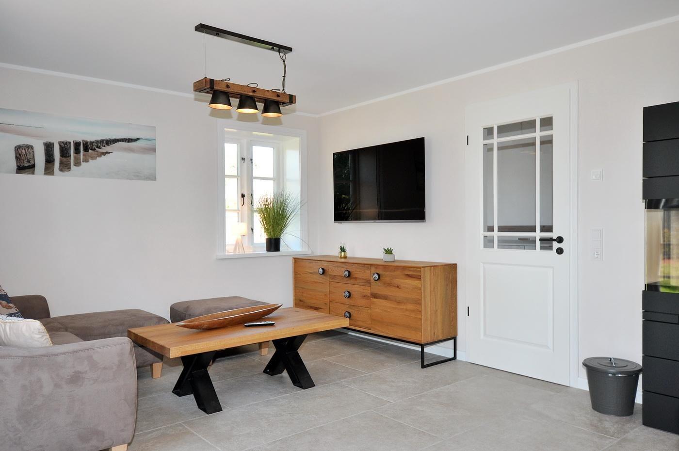 Erdgeschoss: Eingangsbereich, Wohnraum mit inegrierter Küche, Essbereich, Kamin und Zugang zur Terrasse, ein Schlafzimmer mit Doppelbett (200 x 200 cm - Einzelmatratzen) und TV, ein Duschbad/ WC, ein Hauswirtschaftsraum