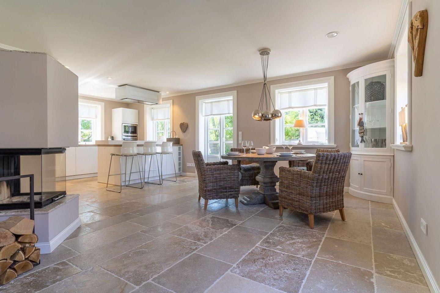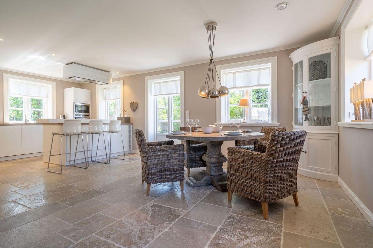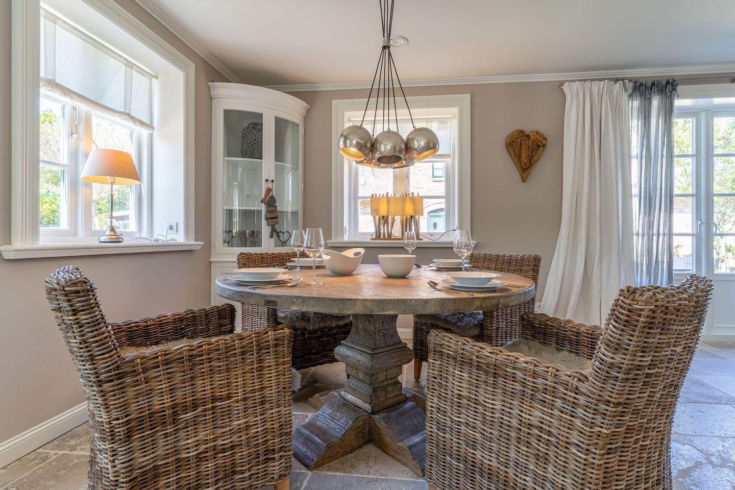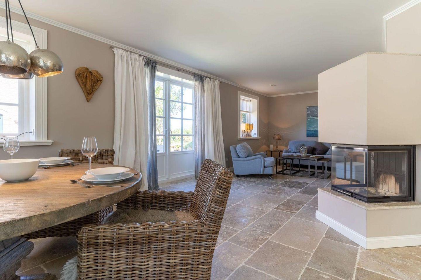 Die luxuriöse Haushälfte unter Reet verfügt über ca. 105 m² Wohnfläche und bietet Platz für 4 Personen. Im Erdgeschoss befindet sich der lichtdurchflutete Wohnraum mit TV, einer offenen Küche sowie einem stilvollen Essbereich. Die Wohnräume sind mit exklusiven Möbeln ausgestattet.
