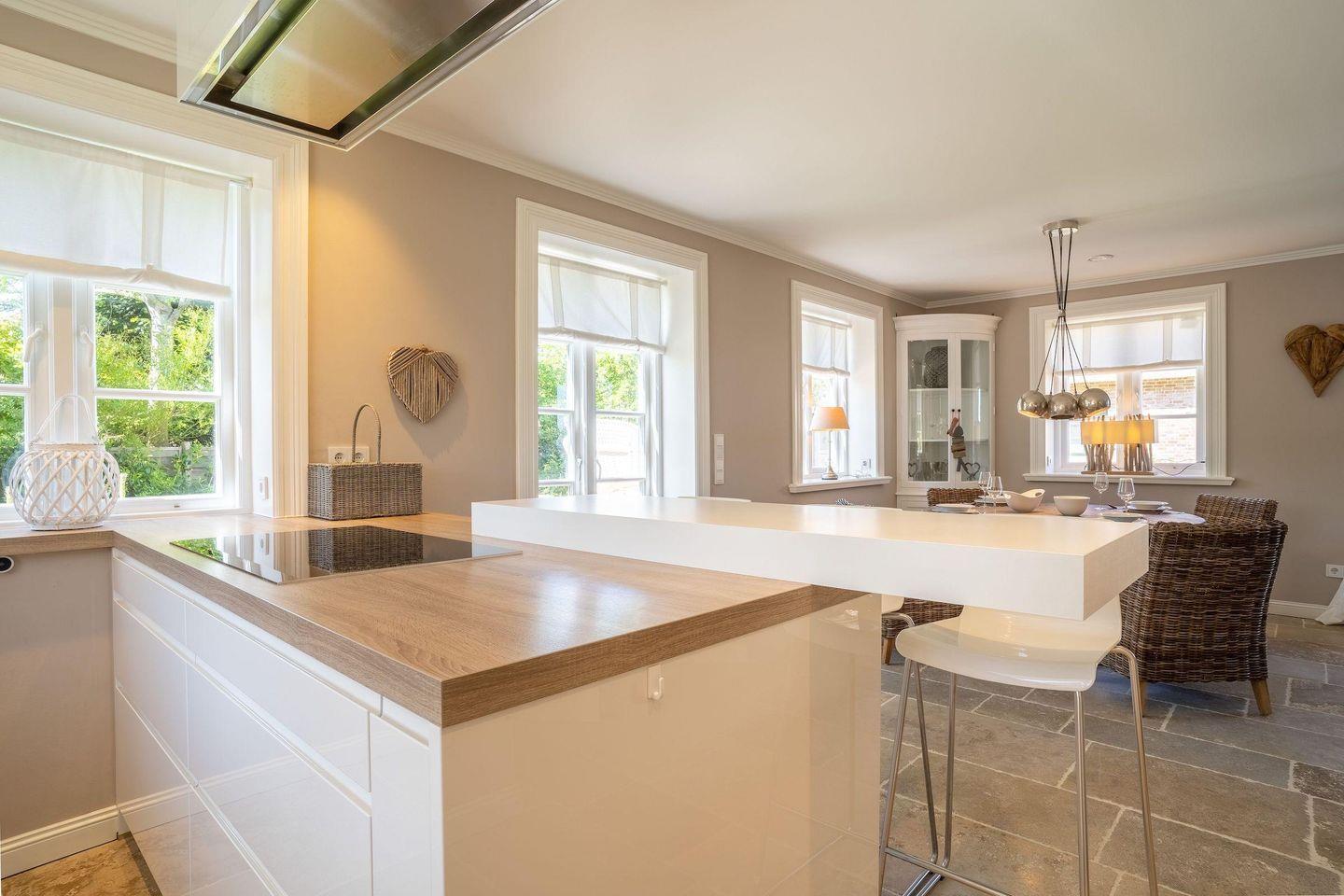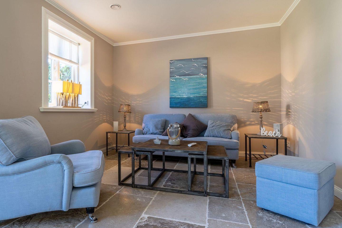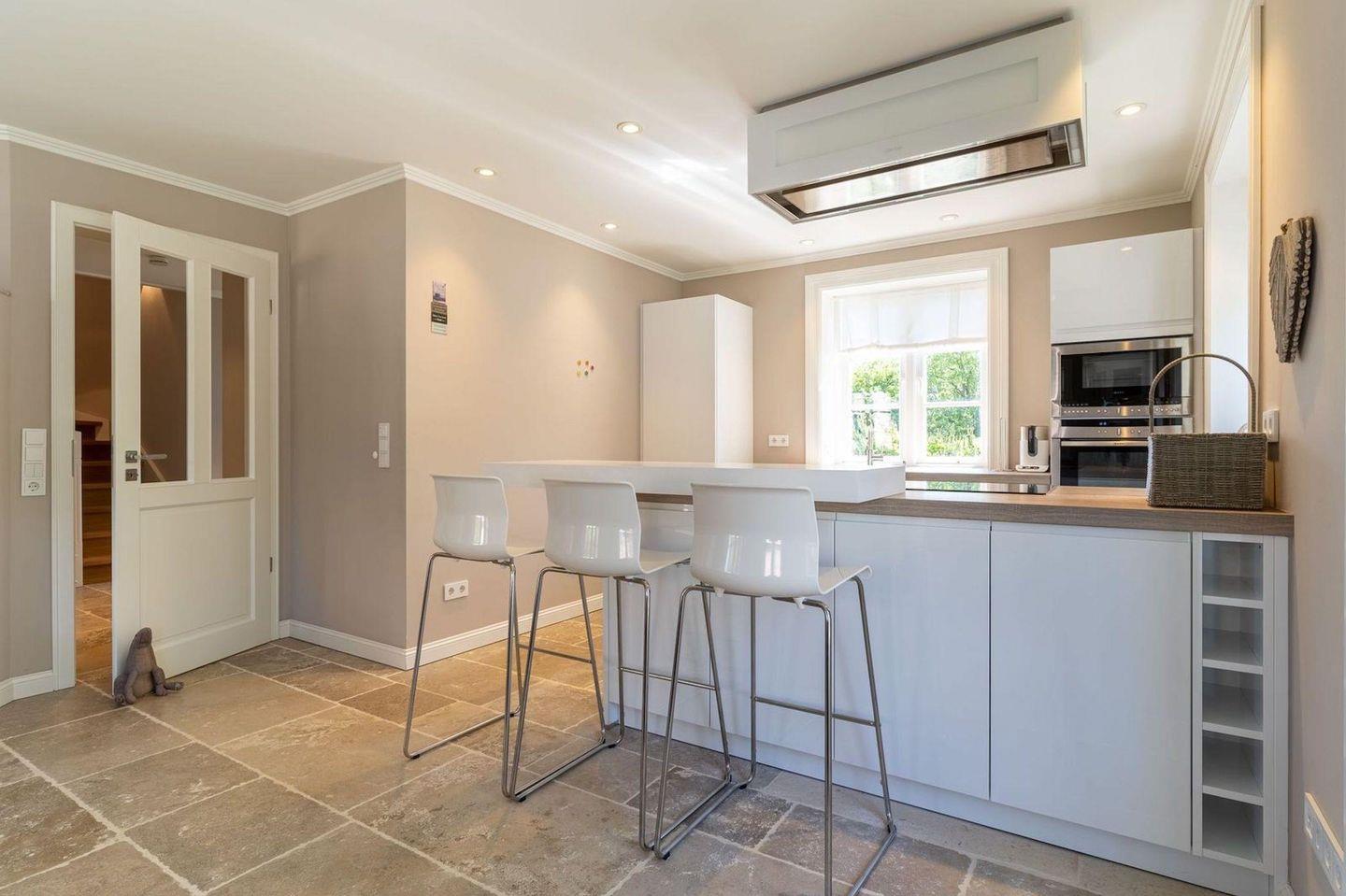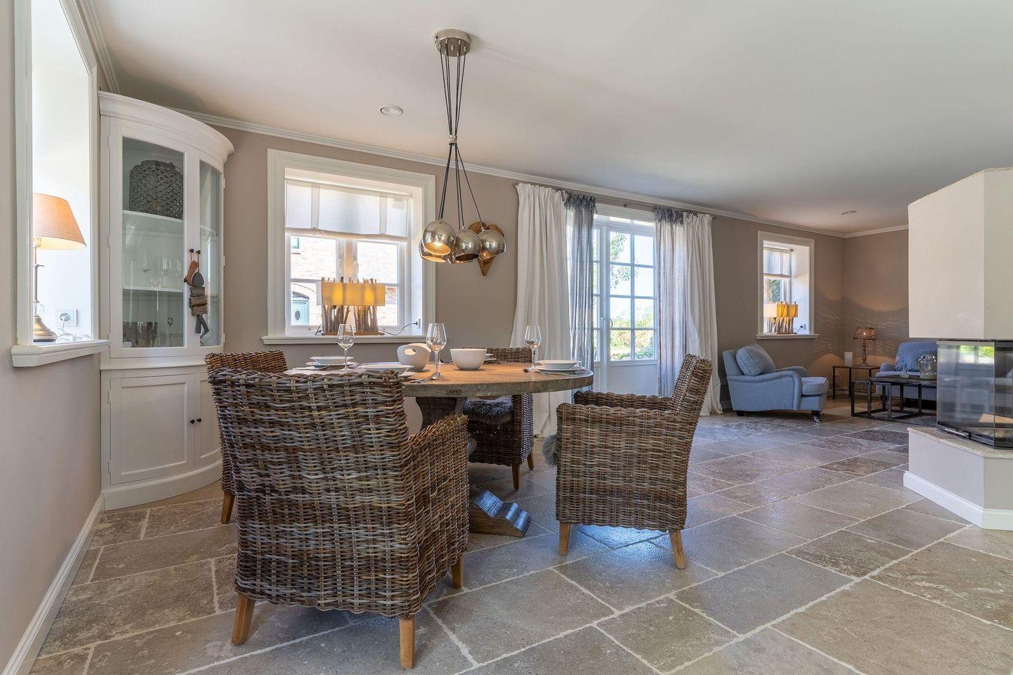 Die luxuriöse Haushälfte unter Reet verfügt über ca. 105 m² Wohnfläche und bietet Platz für 4 Personen. Im Erdgeschoss befindet sich der lichtdurchflutete Wohnraum mit TV, einer offenen Küche sowie einem stilvollen Essbereich. Die Wohnräume sind mit exklusiven Möbeln ausgestattet.