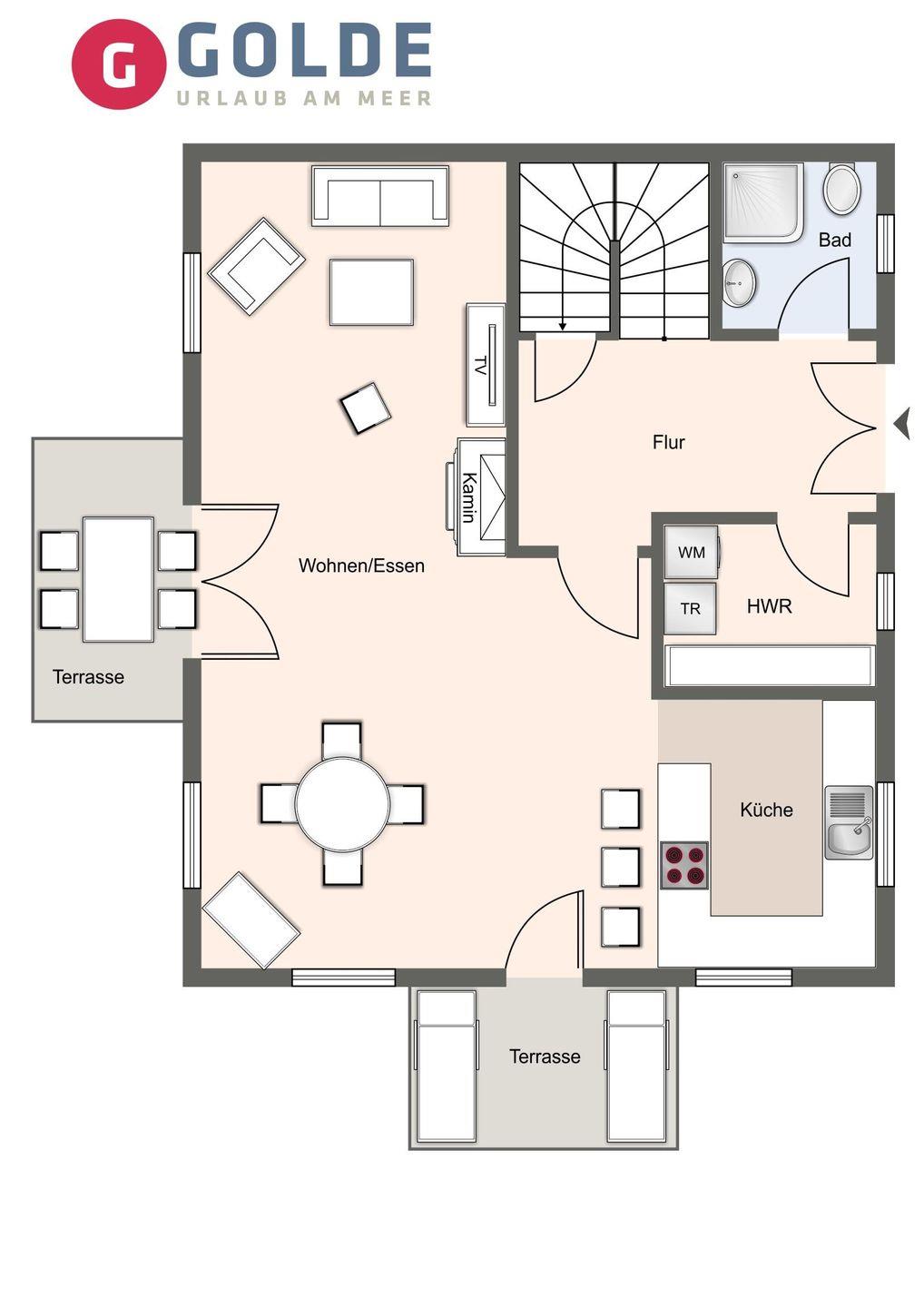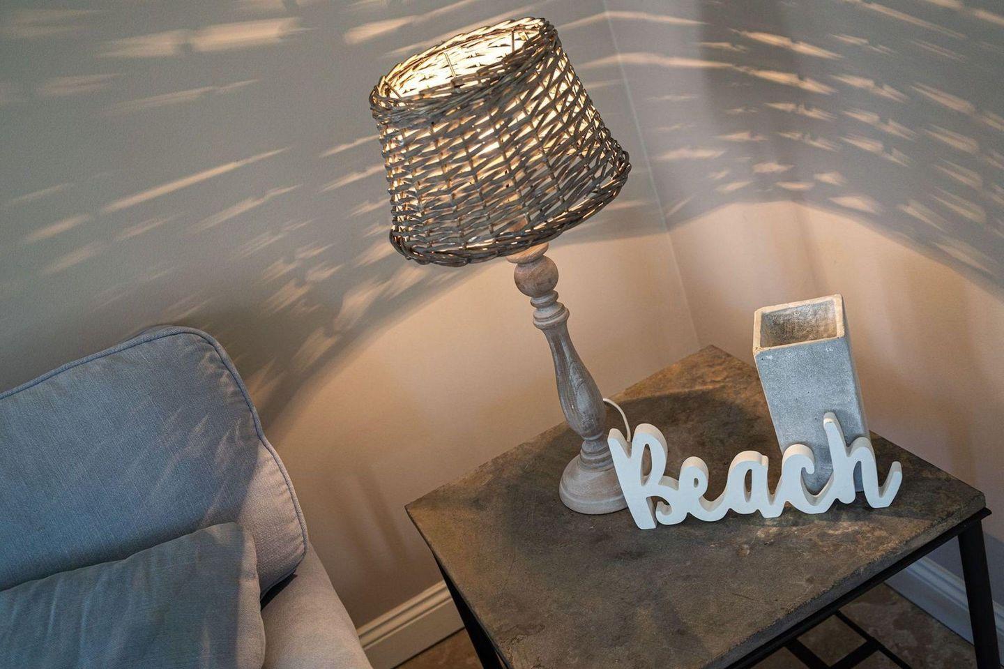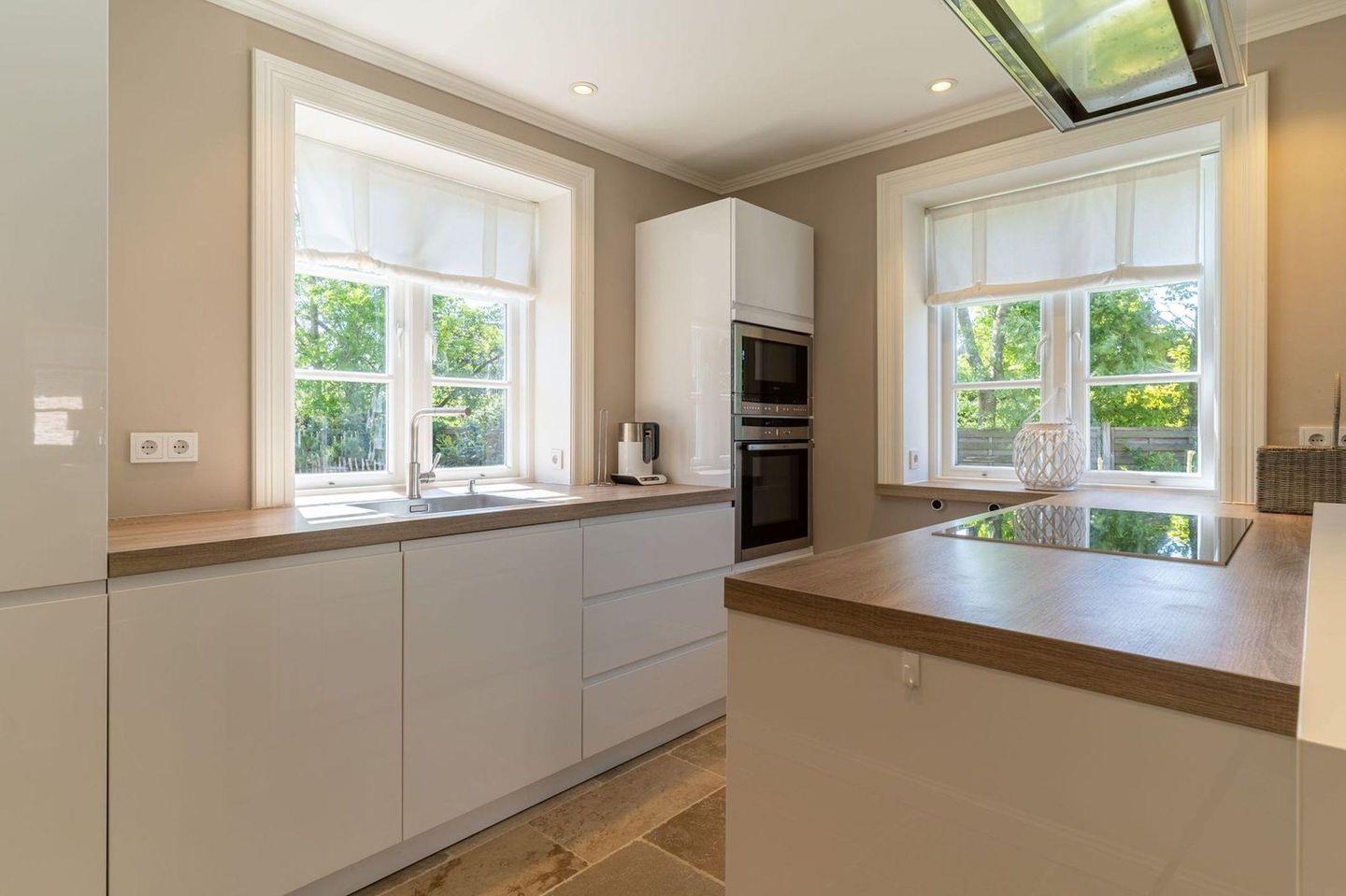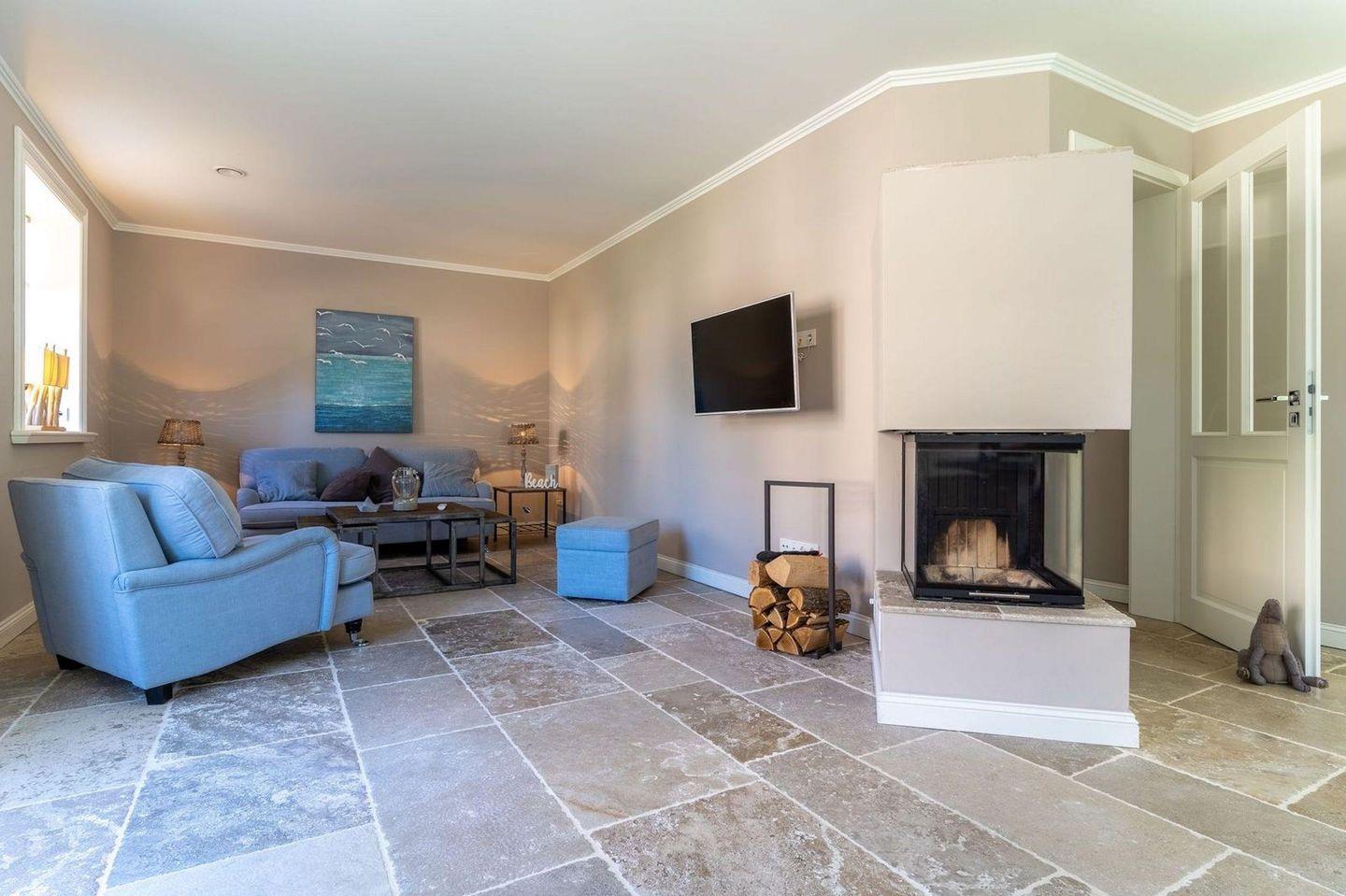 Die luxuriöse Haushälfte unter Reet verfügt über ca. 105 m² Wohnfläche und bietet Platz für 4 Personen. Im Erdgeschoss befindet sich der lichtdurchflutete Wohnraum mit TV, einer offenen Küche sowie einem stilvollen Essbereich. Die Wohnräume sind mit exklusiven Möbeln ausgestattet.