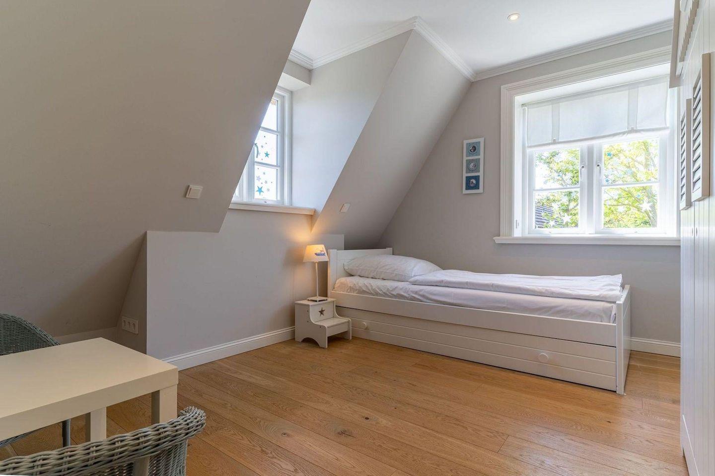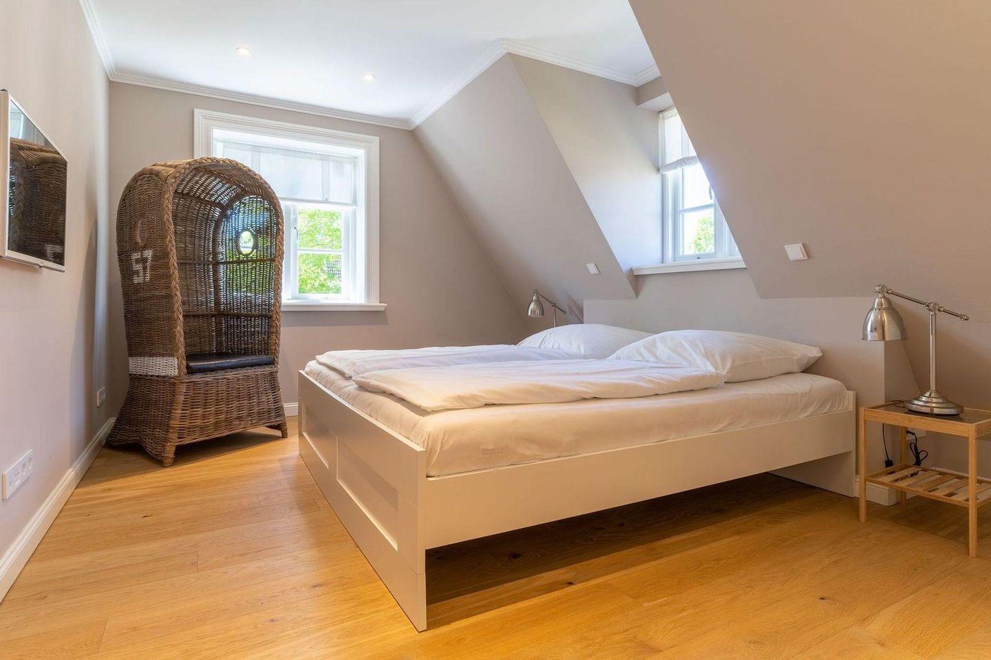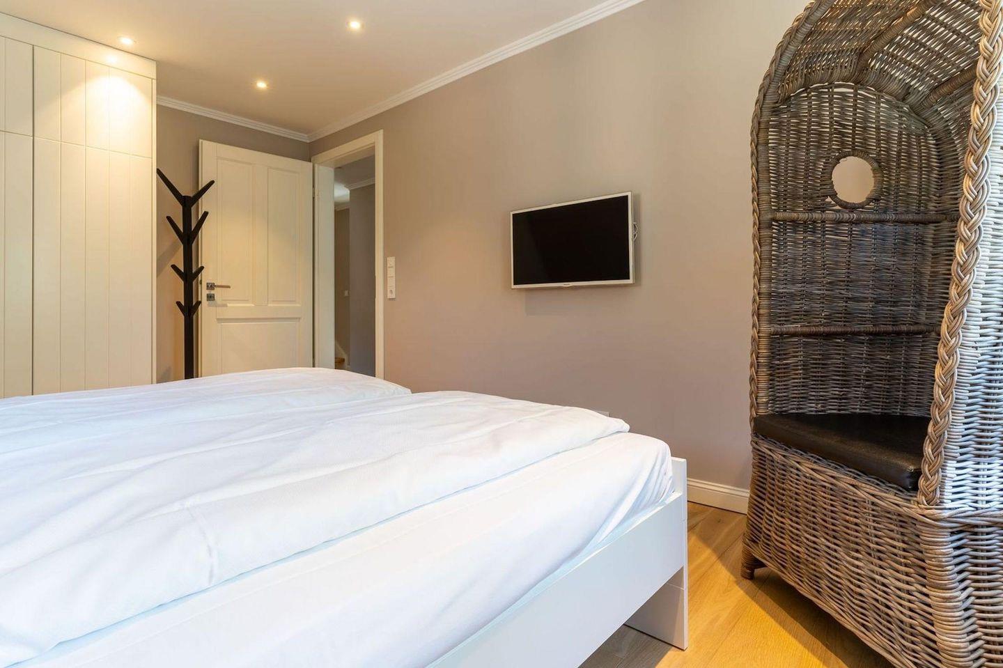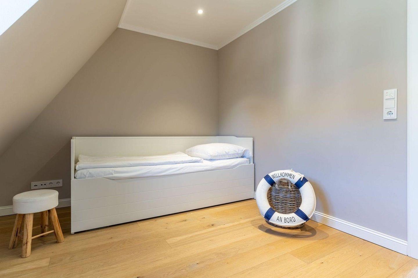 Über eine Holztreppe gelangt man in das Obergeschoss. Dieses verfügt ebenfalls über eine Fußbodenheizung. Ein Schlafzimmer ist mit einem Doppelbett plus TV ausgestattet und bietet jeden Komfort. Darüber hinaus befinden sich im Obergeschoss zwei weitere Schlafzimmer, mit je einem hochwertigen Einzelbett. Einbauschränke gewähren Ihnen hinreichend Ablageflächen. Ebenfalls befindet sich im Obergeschoss ein weiteres, geräumiges Bad mit Dusche und Badewanne. Dieses wunderschöne Haus lässt keine Wünsche offen und bringt Sie sofort in Urlaubsstimmung.