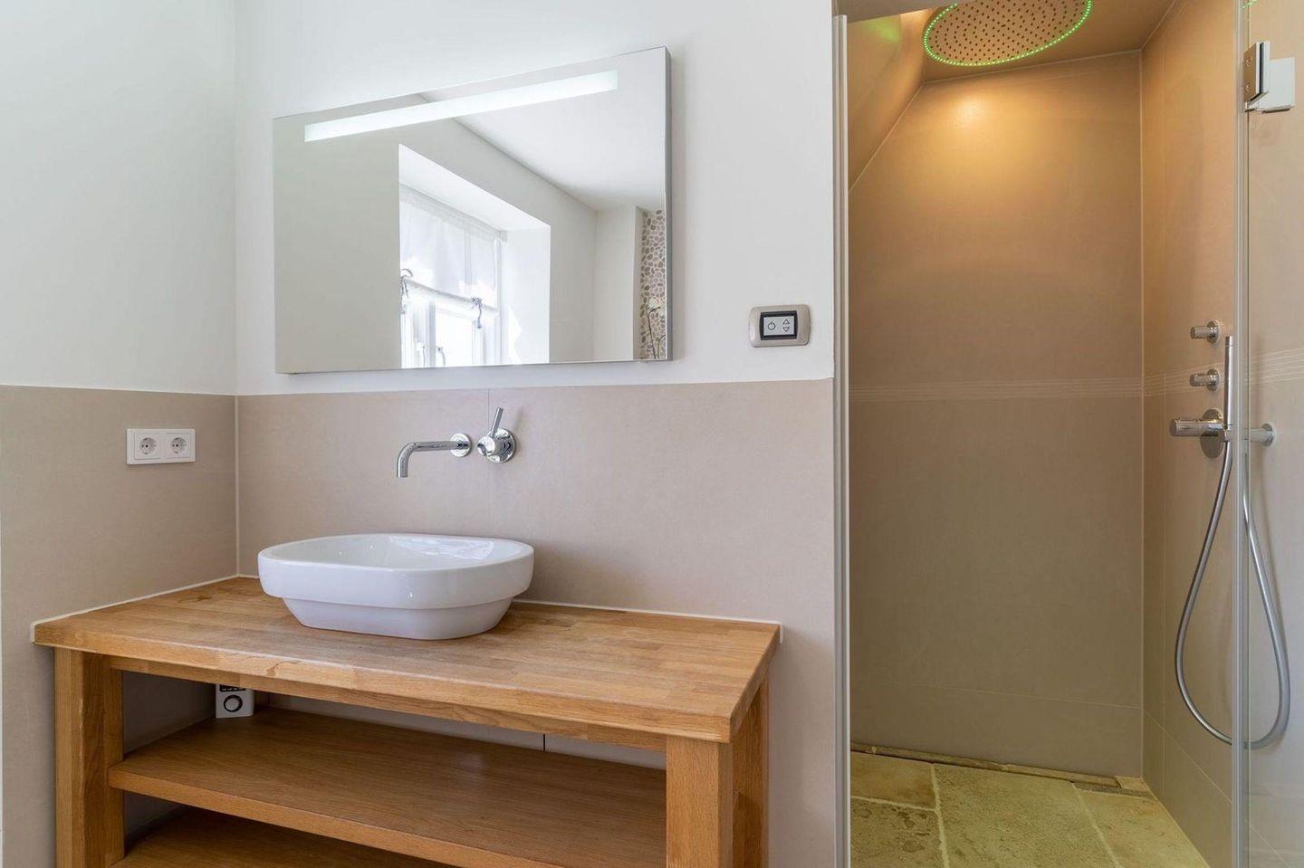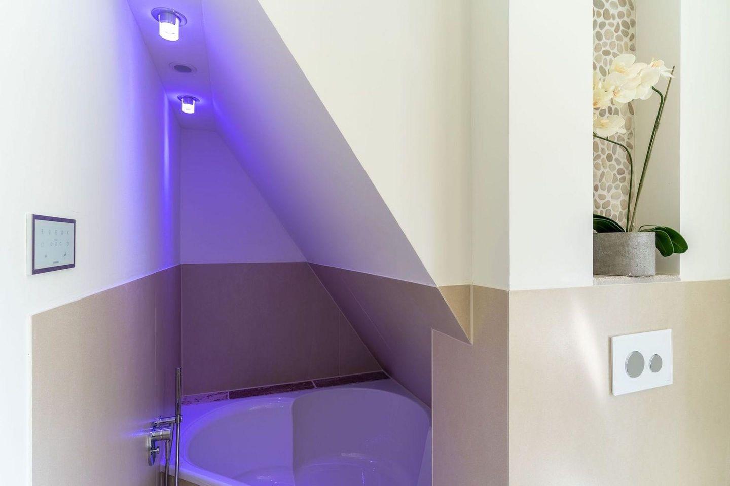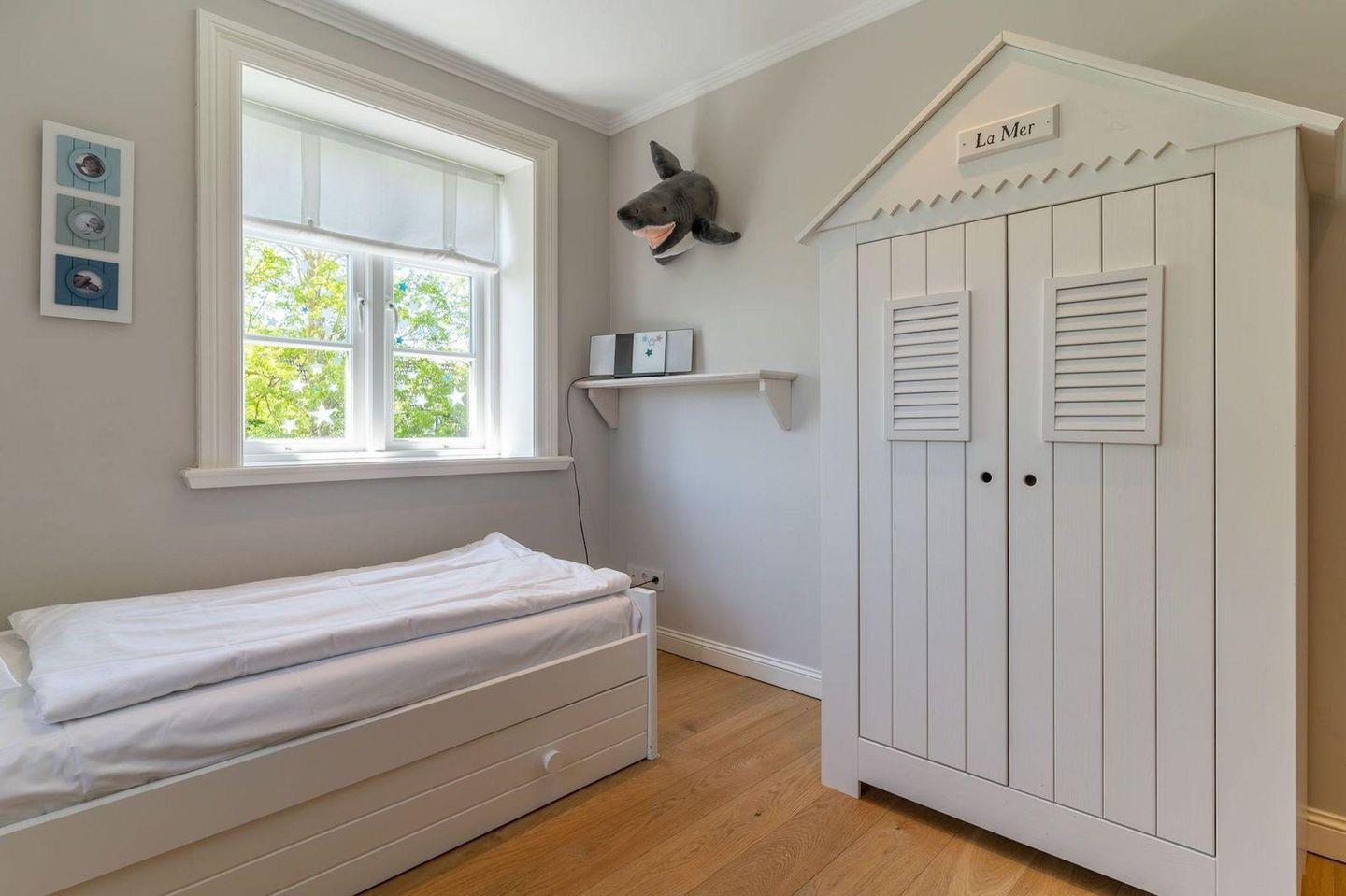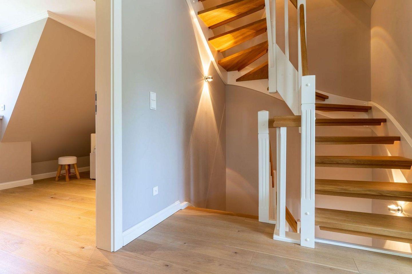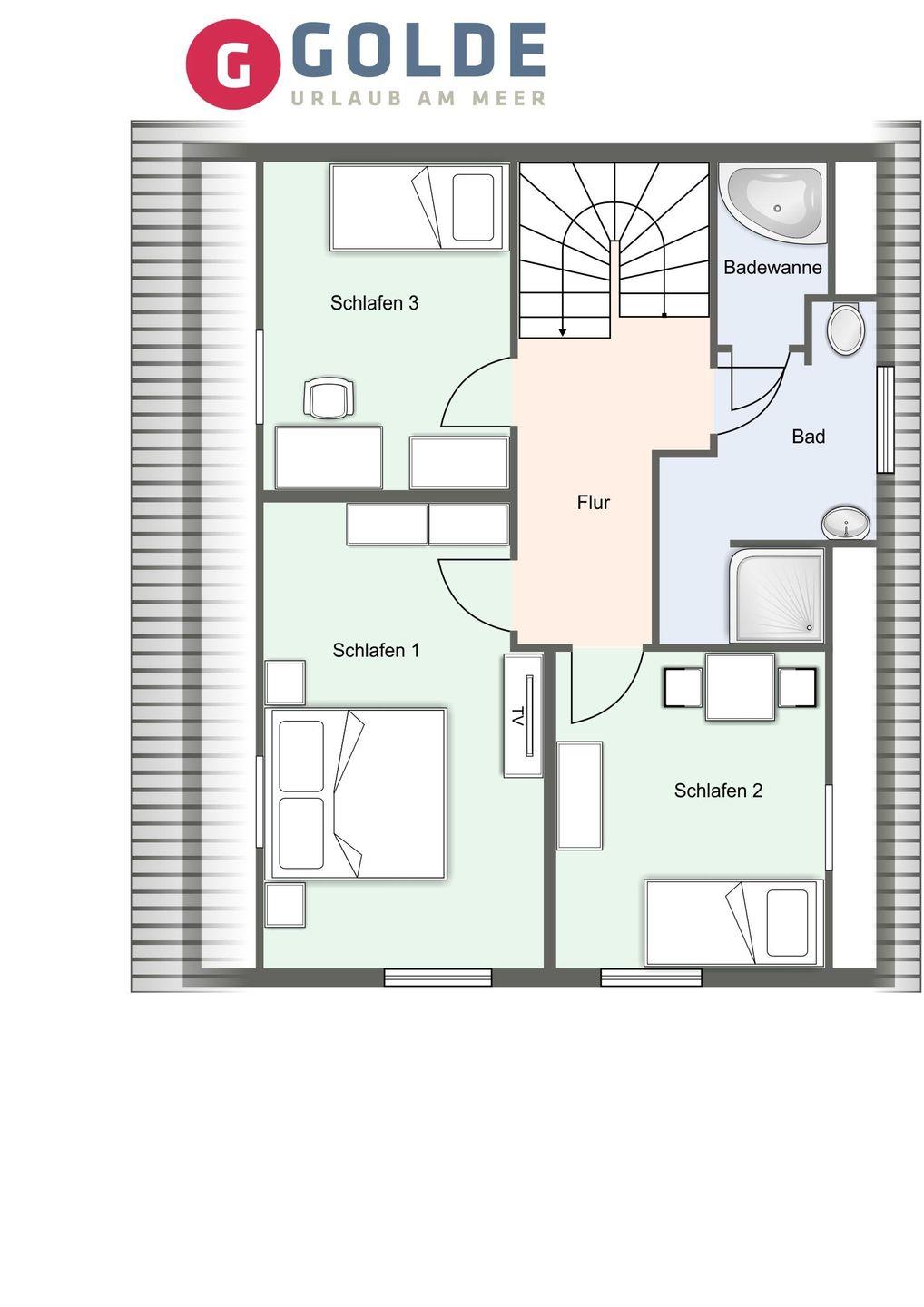 Über eine Holztreppe gelangt man in das Obergeschoss. Dieses verfügt ebenfalls über eine Fußbodenheizung. Ein Schlafzimmer ist mit einem Doppelbett plus TV ausgestattet und bietet jeden Komfort. Darüber hinaus befinden sich im Obergeschoss zwei weitere Schlafzimmer, mit je einem hochwertigen Einzelbett. Einbauschränke gewähren Ihnen hinreichend Ablageflächen. Ebenfalls befindet sich im Obergeschoss ein weiteres, geräumiges Bad mit Dusche und Badewanne. Dieses wunderschöne Haus lässt keine Wünsche offen und bringt Sie sofort in Urlaubsstimmung.