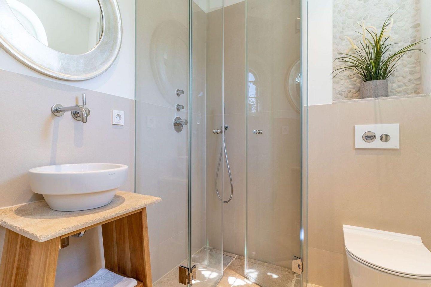 Die Küche verfügt über hochwertige Elektrogeräte. An den Wohnbereich schließen sich ein Flur, ein Hauswirtschaftsraum und ein Duschbad an. Das gesamte Erdgeschoss verfügt über sehr exklusive Fußbodenfliesen, die über eine Fußbodenheizung beheizt werden können.