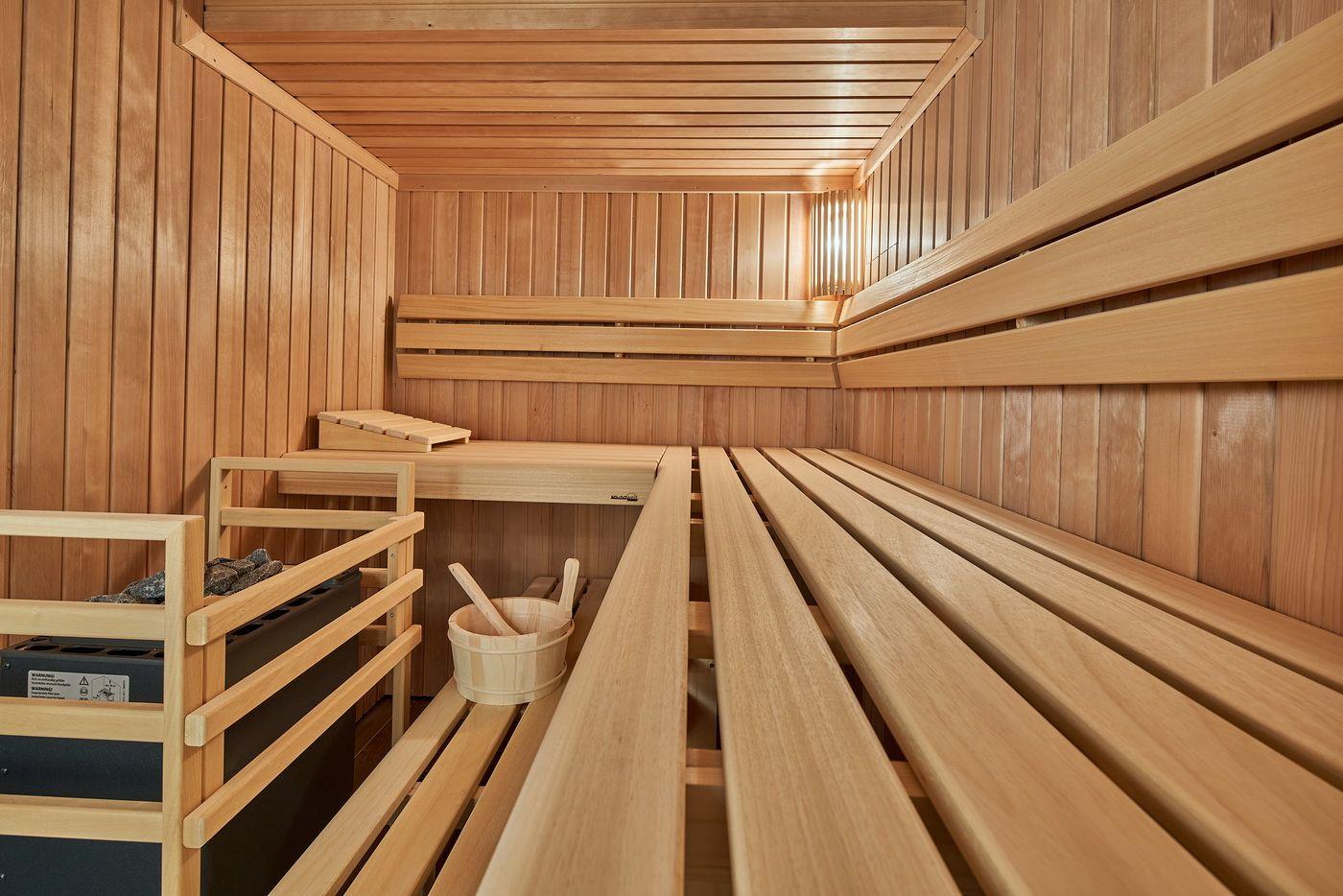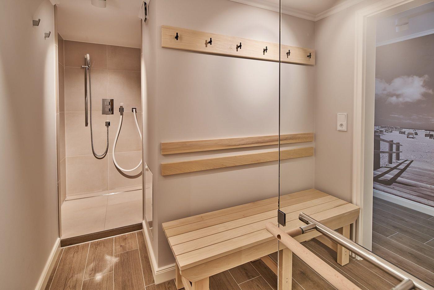 Darüber hinaus finden Sie hier auch den Wellnessbereich mit Gemeinschaftssauna, sowie Dusche und WC.