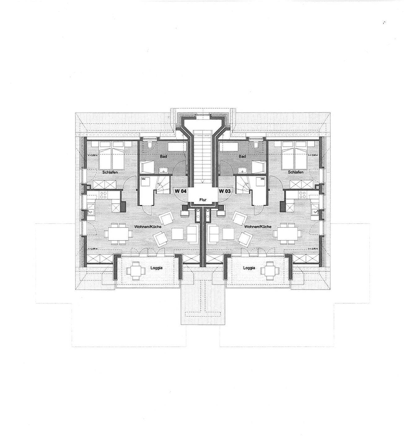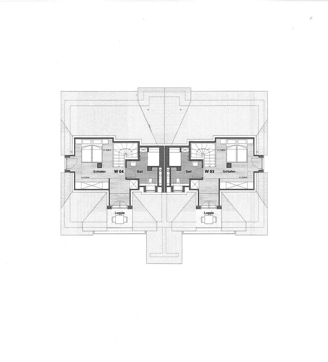Dachgeschoss: ein offenes Schlafzimmer mit Doppelbett (180 x 200m) mit Zugang zur Loggia, ein Duschbad