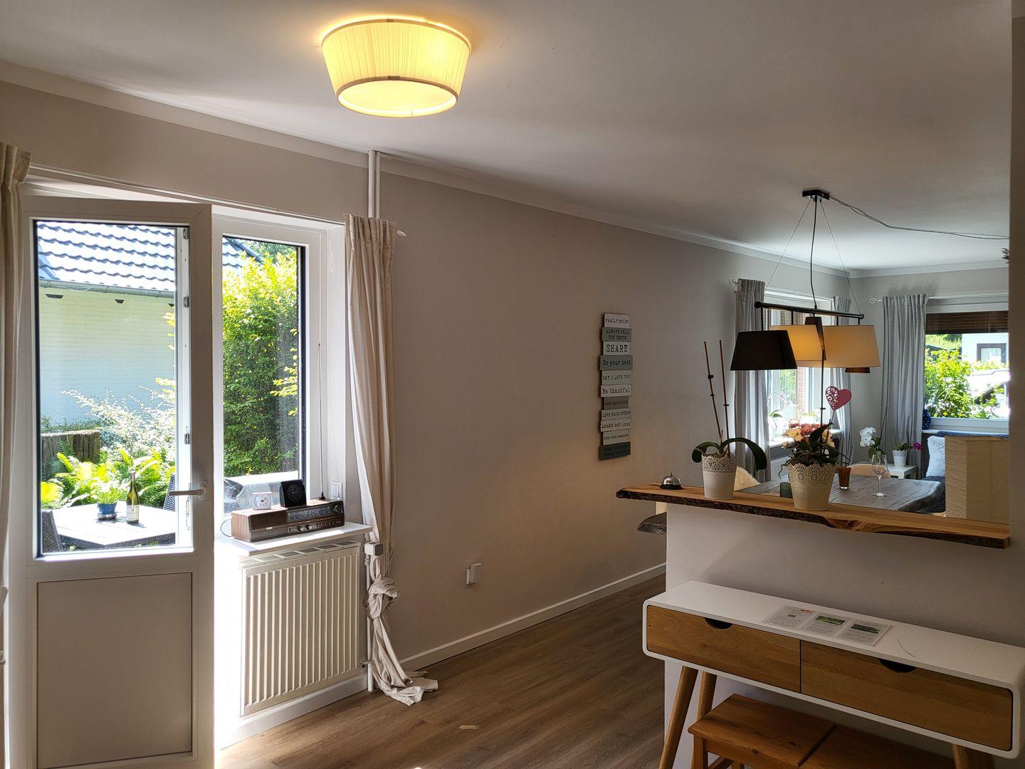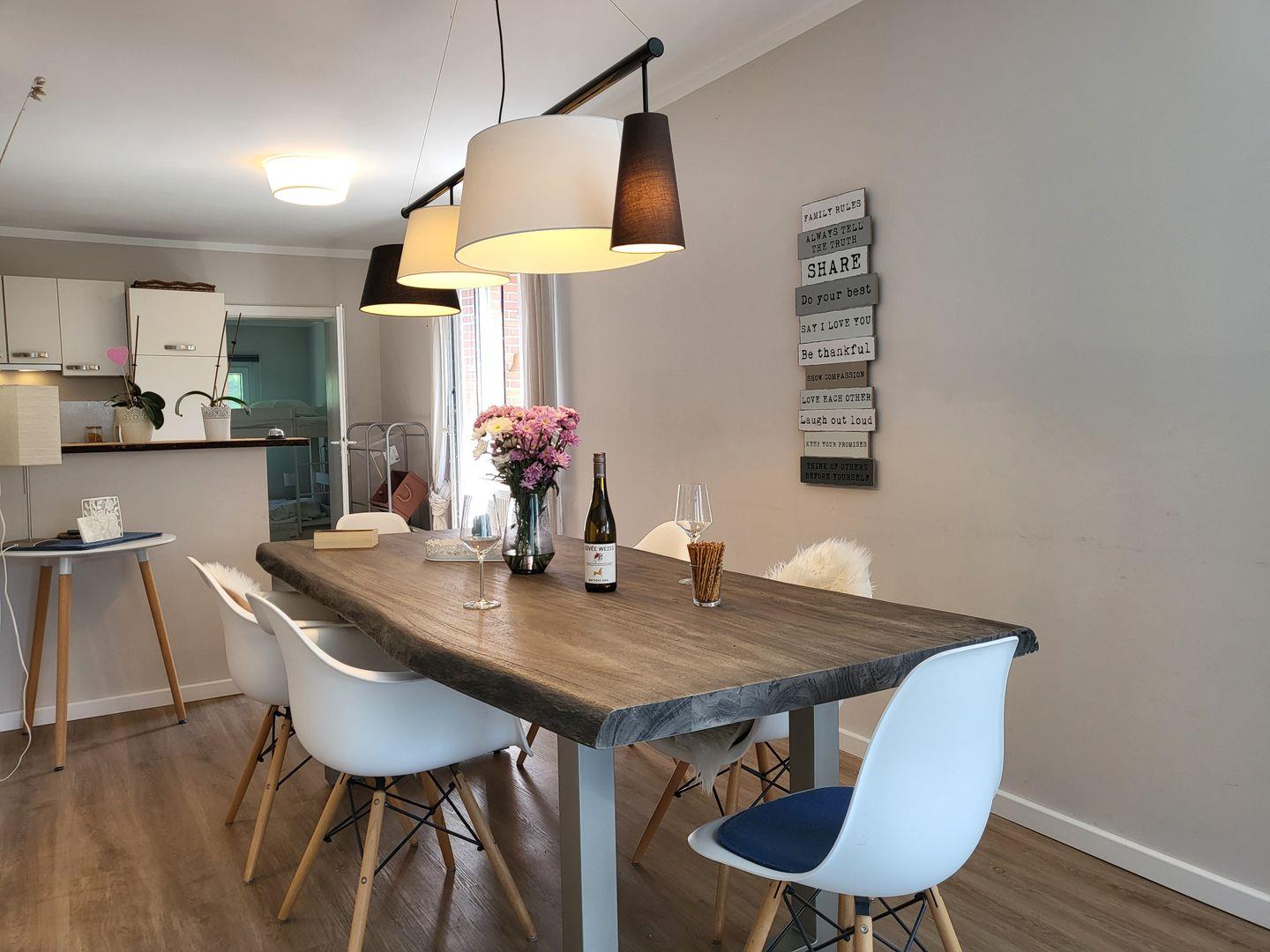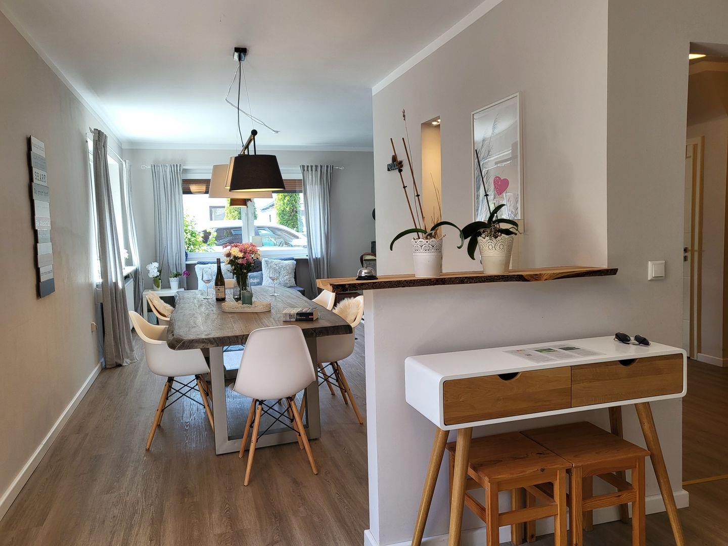 Die Wohnung 5 im Erdgeschoss ist die größte Wohnung vom Haus Windjammer. Mit 100qm ist es sehr großzügig aufgeteilt und bietet viel Platz. Wohnzimmer, Essbereich und Küche sind offen gestaltet und gehen ineinander über.