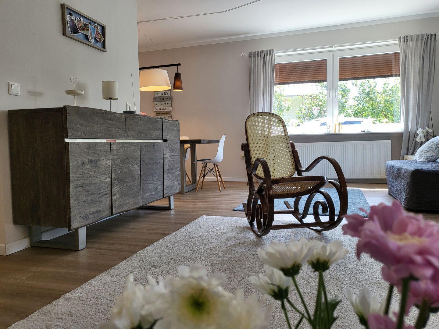 Bahnhofsnah gelegene 3 Zimmer-Wohnung für 5 Personen im Erdgeschoss. Großer Gemeinschaftsgarten, Wohnraum mit gemütlicher Couch und Kaminofen.