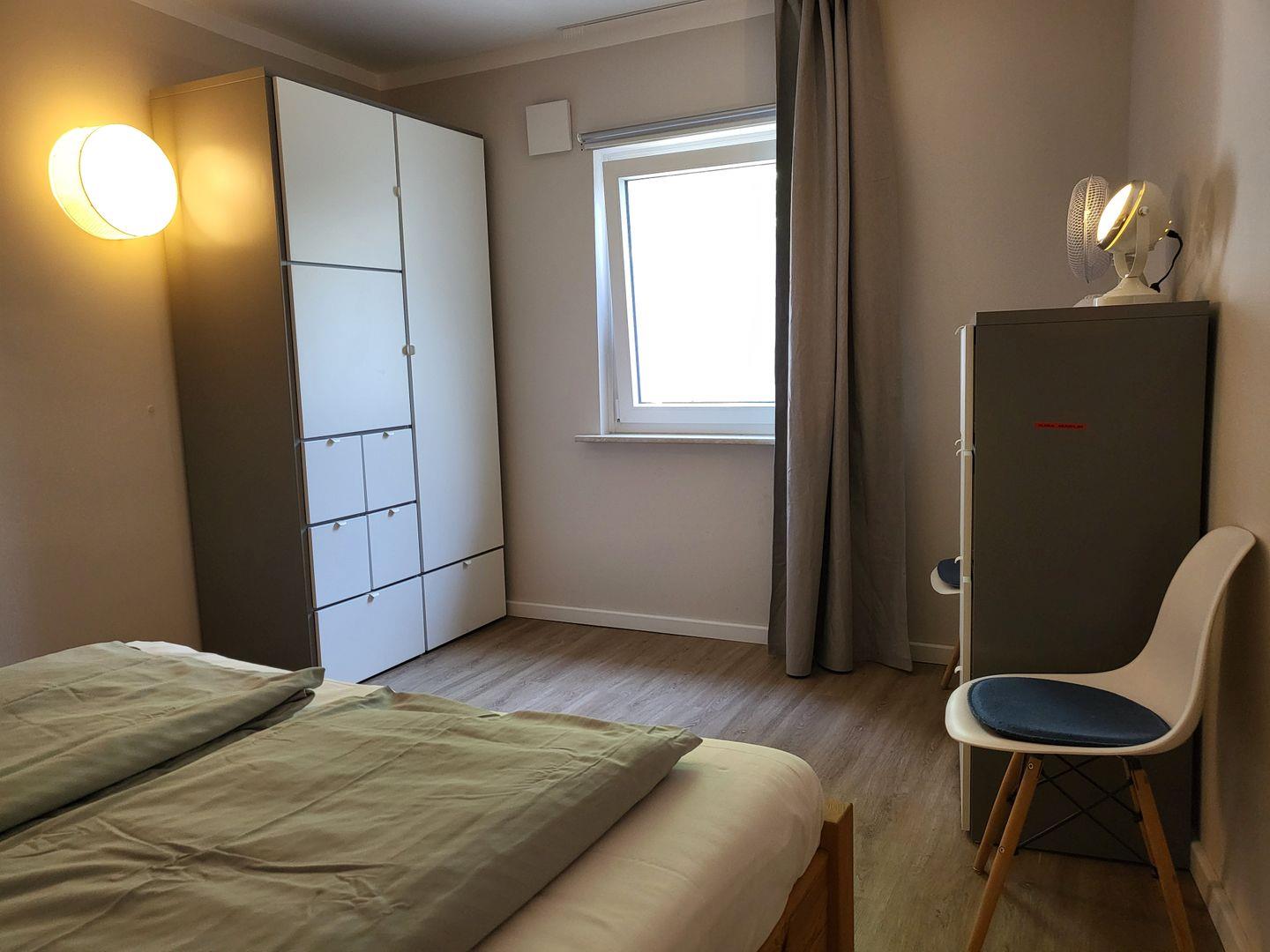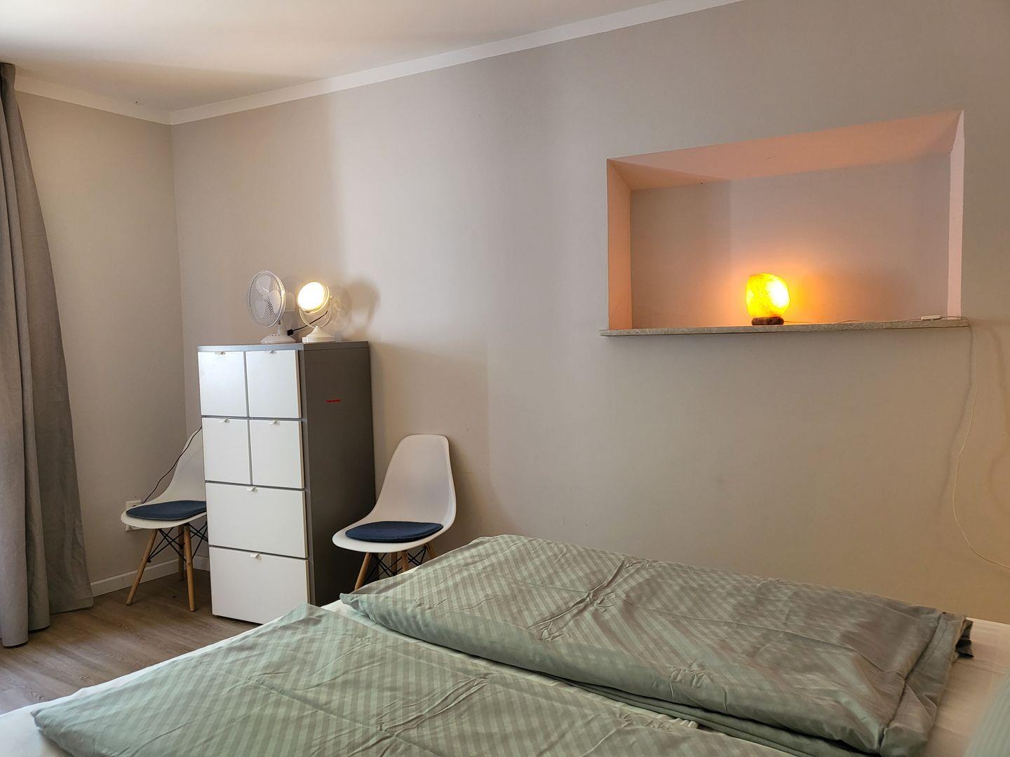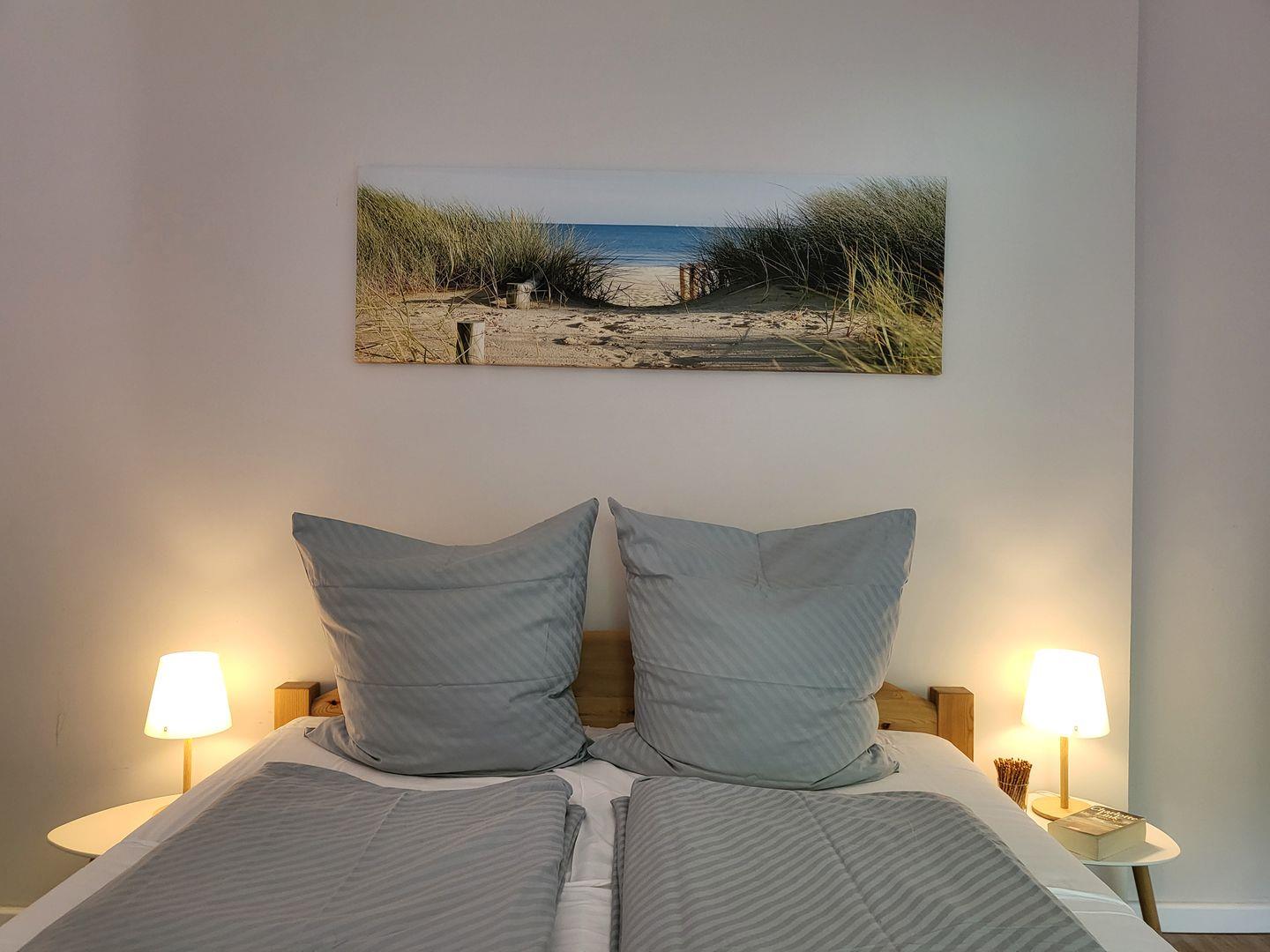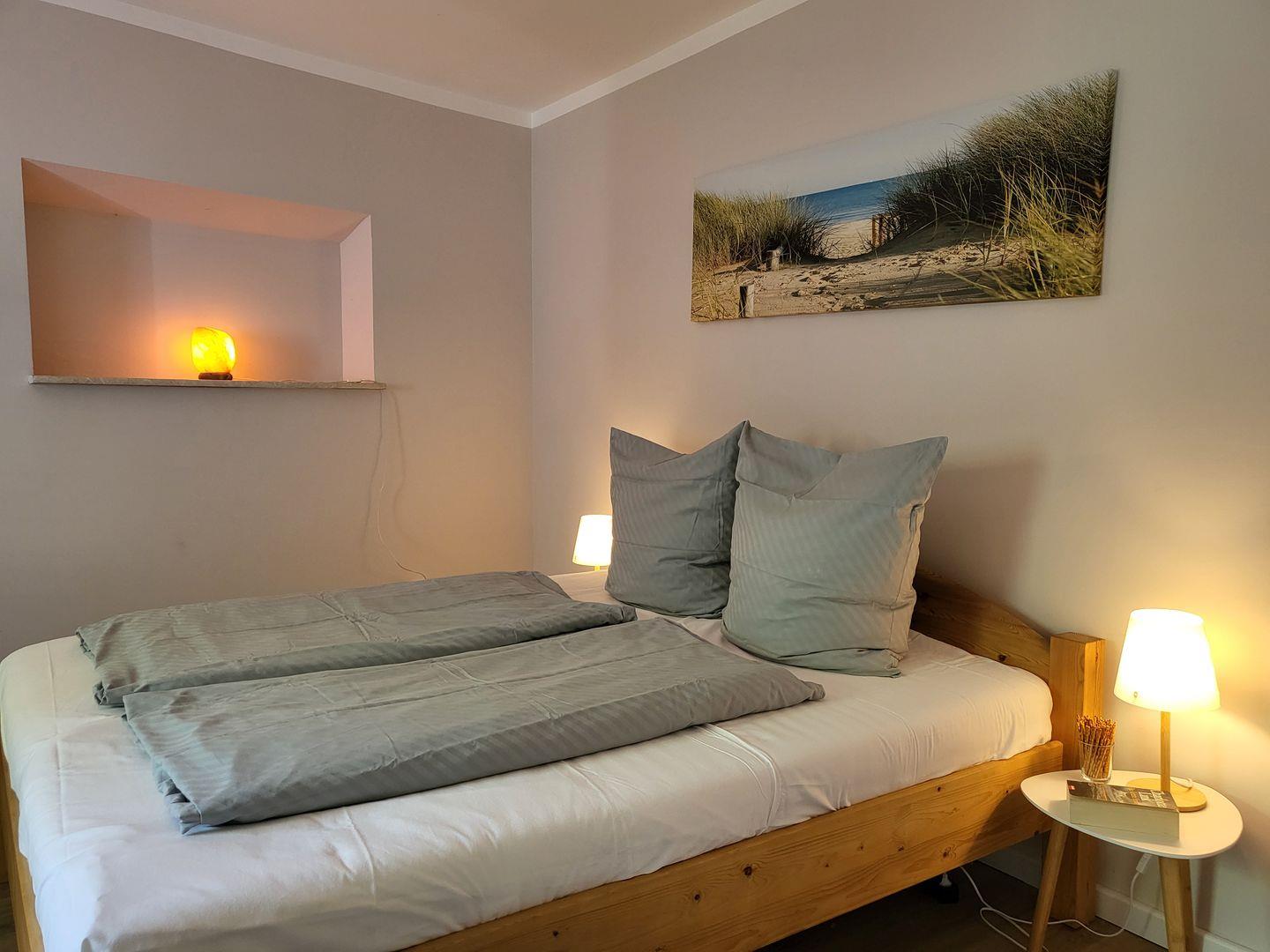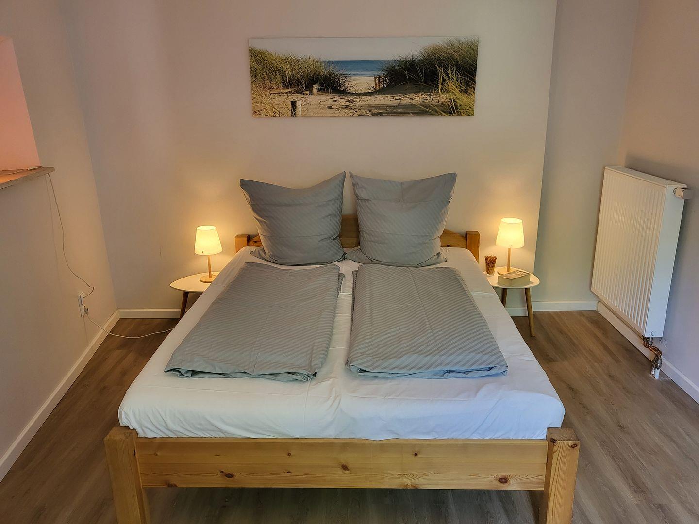 Das Schlafzimmer liegt am hintersten Ende des Hauses der Ferienwohnung, mit einem Doppelbett 180x200 cm und einem Kleiderschrank. Dort ist es besonders ruhig. Selbst wenn in der Küche der Kaffee gemahlen wird kann hier weitergeschlafen werden.