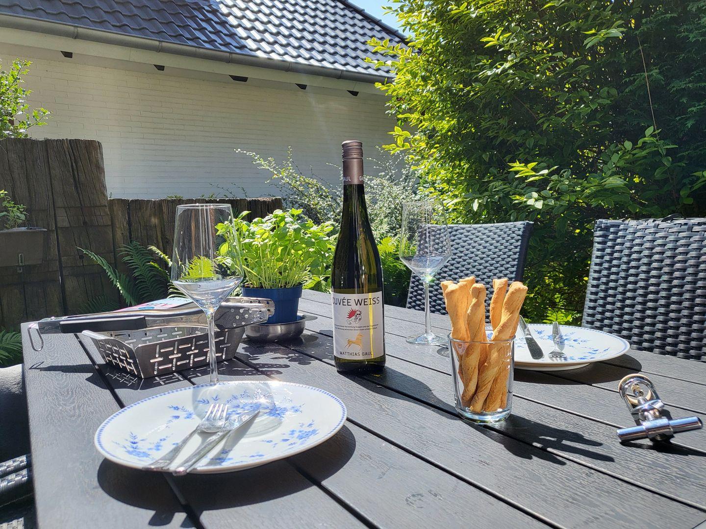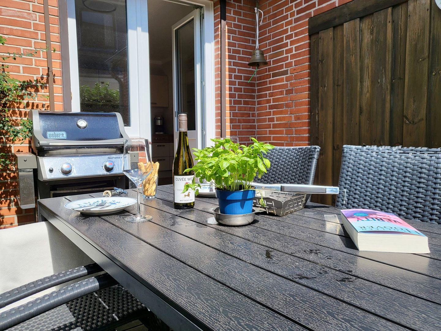 Die Wohnung hat zusätzlich zu dem Gemeinschaftsgarten eine eigene Frühstücks-Terrasse mit einem Weber Gas Grill.