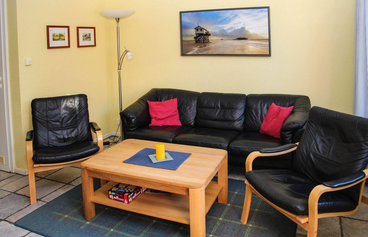 1995 erbaute, ruhige Reetdach-Reihenhausanlage im idyllischen Dorfteil hinter den Dünen. Dorfzentrum mit Restaurants, Cafés und Einkaufsmöglichkeiten in 3 Gehminuten erreichbar. Seedeich mit Strandübergang nach ca. 8 Minuten Fußweg durch die Dünen. Das 50 qm große Reihenmittelhaus erstreckt sich über 2 Etagen im dänischen Stil. Ausgestattet mit Kabel-TV, WLAN, Mikrowelle, Geschirrspüler, Fußbodenheizung. Terrasse mit Gartenmöbeln, PKW-Stellplatz am Haus. Erdgeschoss: Wohnraum mit Essecke und offener Küche, kleines Duschbad/WC, Abstellraum. Obergeschoss: 2 Schlafräume, 5 Betten (1 Doppelbett, 3 Einzelbetten).