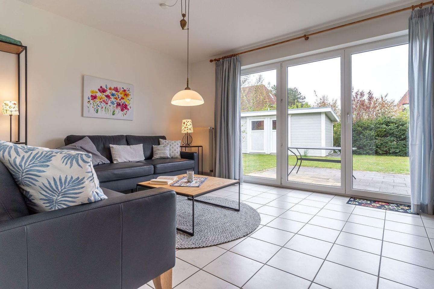 Die Terrasse mit Garten liegt in Richtung Südwesten, und ein Gartenhaus bietet Platz für Strandutensilien und Fahrräder. Ein reservierter Auto-Stellplatz steht vor dem Haus zur Verfügung.