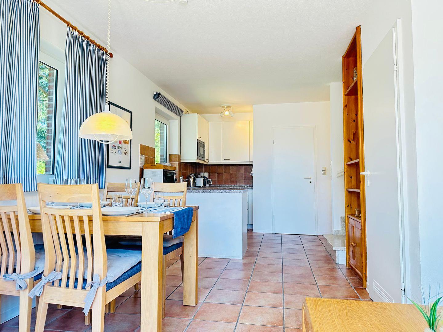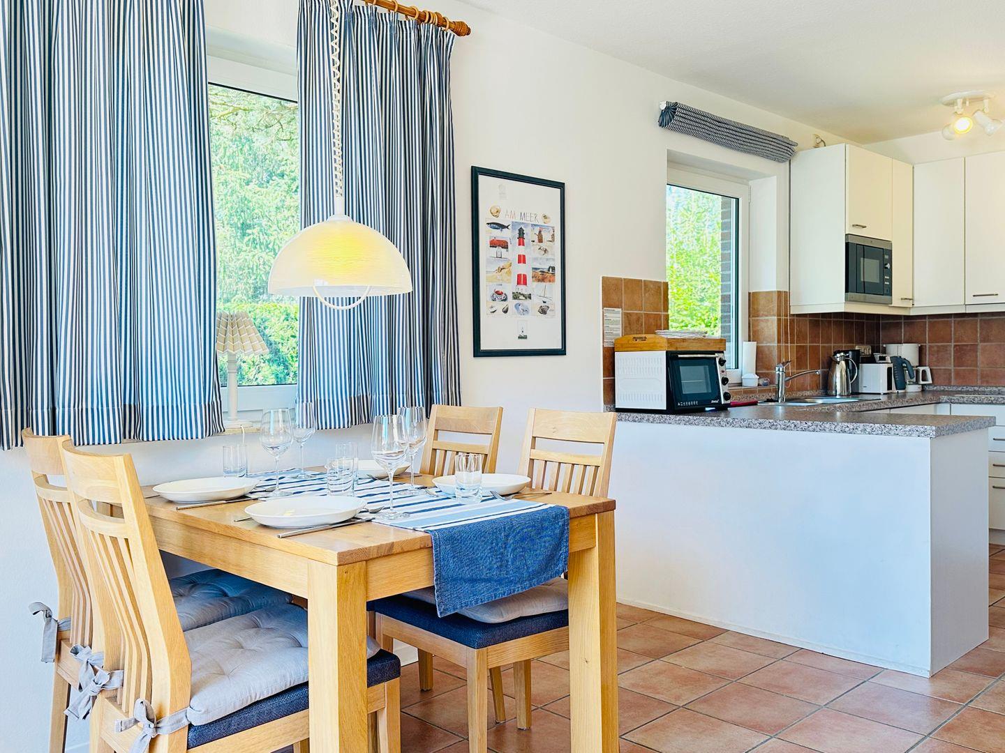 Die ca. 55 qm erstrecken sich über zwei Etagen und präsentieren eine freundliche Einrichtung im dänischen Stil. Die offene Küche im Erdgeschoss ist gut ausgestattet, inklusive Geschirrspüler und Mikrowelle. Der Wohn- und Essbereich bietet einen angenehmen Raum für gemeinsame Stunden. Ein Abstellraum und ein Duschbad vervollständigen das Erdgeschoss.