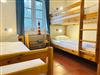 Raumaufteilung: 2 Schlafzimmer (1 Doppelbett, 1 Etagenbett, 1 Einzelbett), Wohn-/Essraum mit offener Einbauküche und Kaminofen,