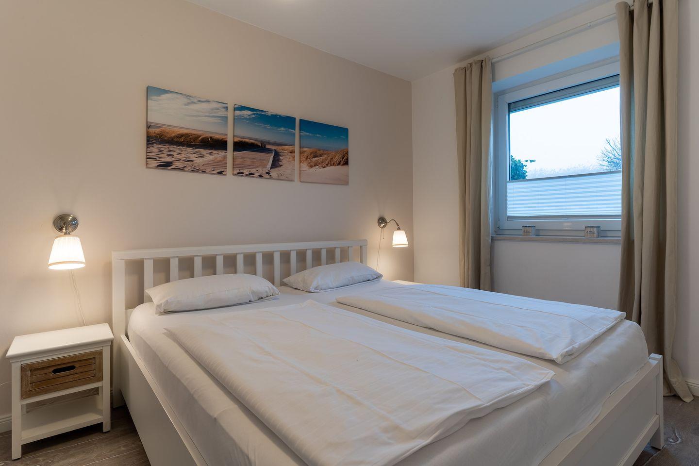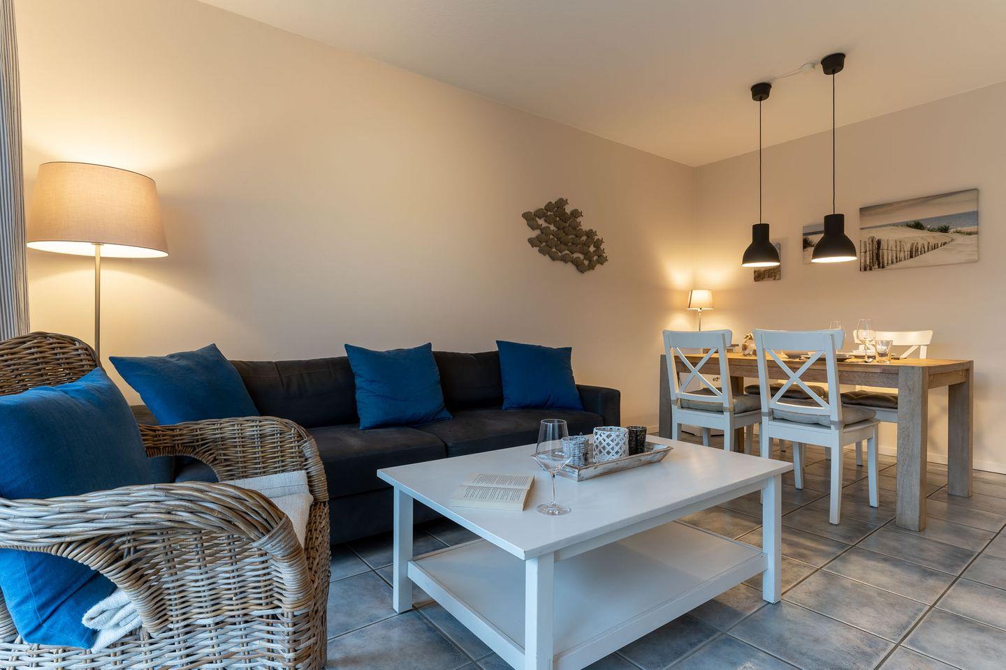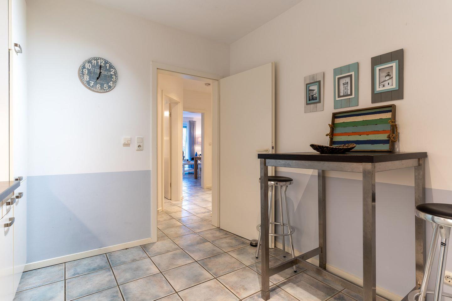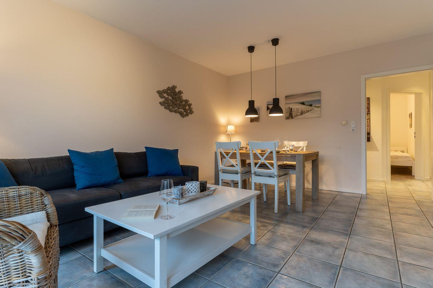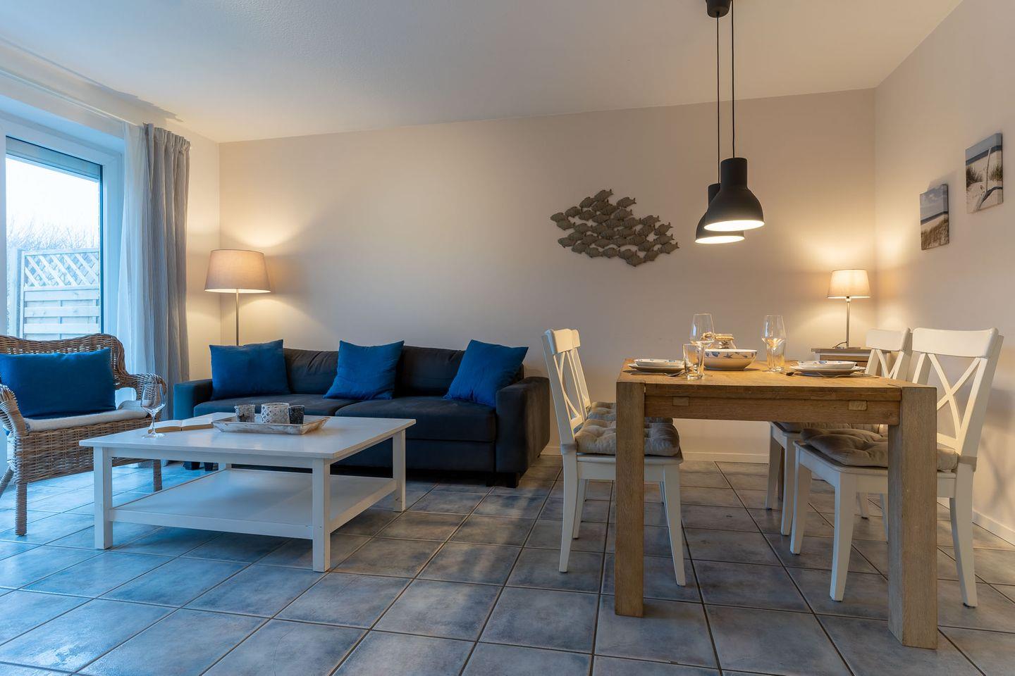 Die Wohnung erstreckt sich über 57 qm im Erdgeschoss und ist in einem freundlichen und maritimen Stil eingerichtet.