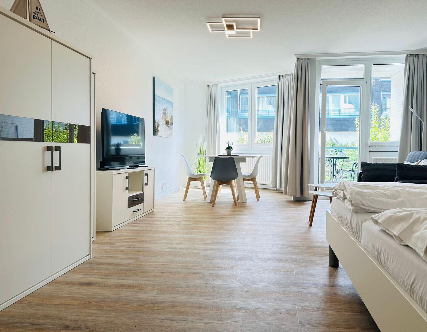 Der Balkon mit Gartenmöbeln bietet eine schöne Möglichkeit, das Frühstück oder entspannte Momente im Freien zu genießen. Die zentrale, dennoch ruhige Lage ermöglicht einen kurzen Fußweg zu Attraktionen wie der Dünentherme, der Promenade und zahlreichen Einkaufsmöglichkeiten sowie Restaurants.