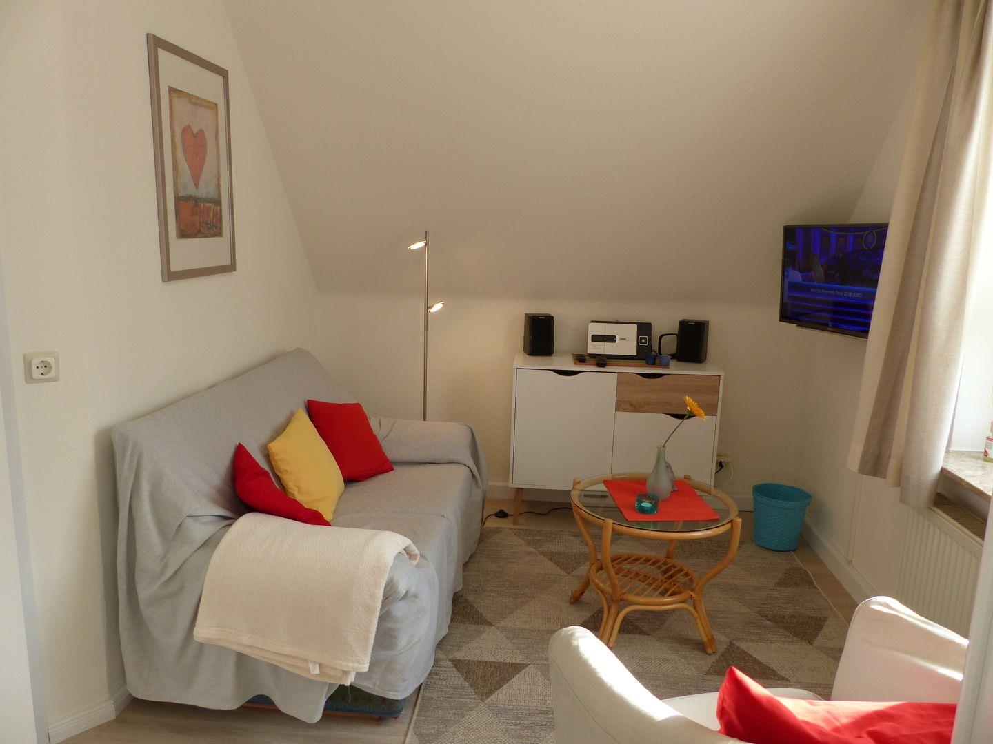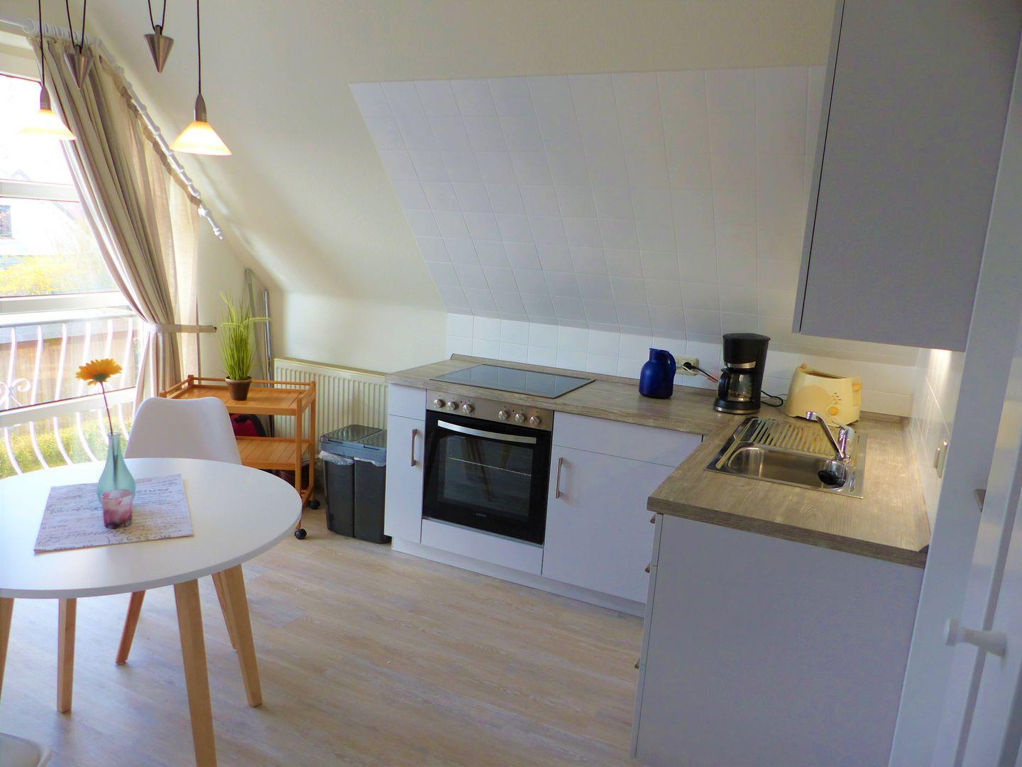 Die gemütliche 40 qm große Wohnung im 1. OG bietet einen offenen Wohn- und Kochbereich mit einem kleinen Sofa, Kabel-TV, Esstisch und einer Einbauküche mit Ceran-Kochfeld und Backofen.