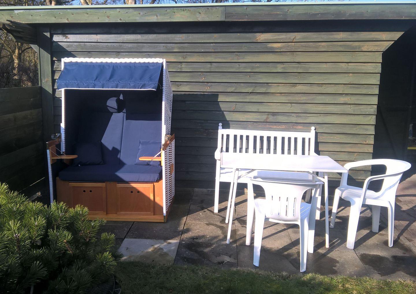 Ein gemeinsam nutzbarer Strandkorb im Garten lädt zum relaxen ein.