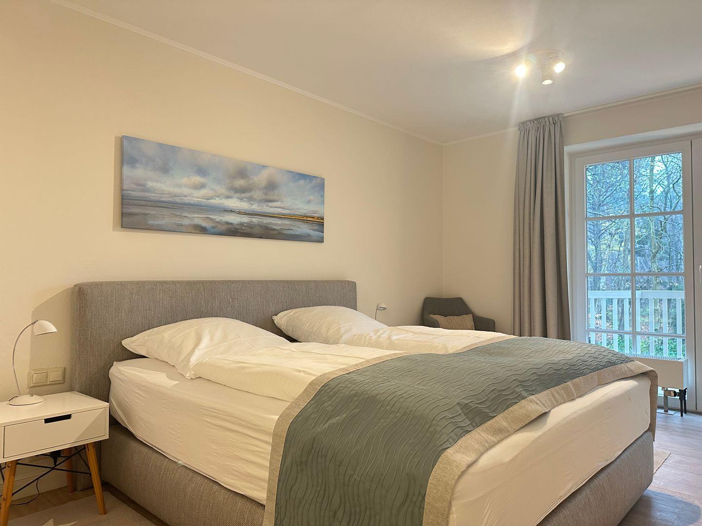 Das Schlafzimmer ist mit einem hochwertigen Boxspringbett ausgestattet, inklusive Bettwäsche und einem TV. Im Wohnzimmer befindet sich ein Schrankbett, das Platz für eine dritte Person bietet.
