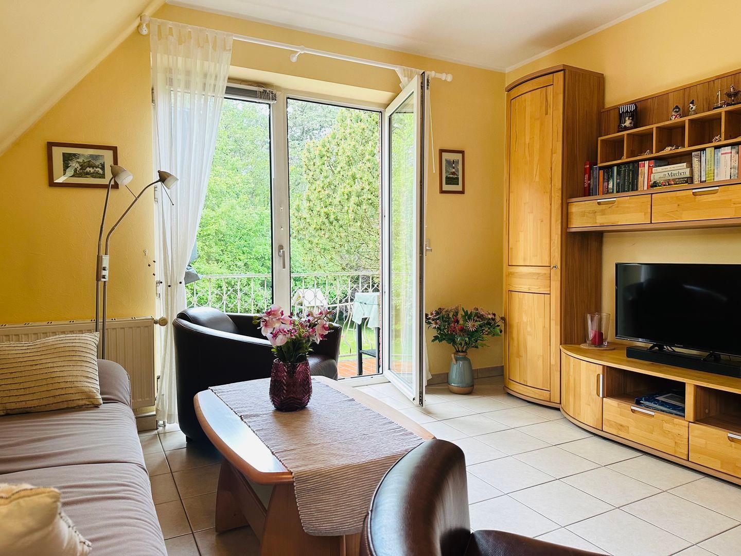 Vom Wohn- und Schlafzimmer aus genießen Sie einen schönen Blick auf das Grundstück mit Spielgeräten und das angrenzende Wäldchen. Beide Räume verfügen über einen Zugang zum Balkon, der mit Gartenmöbeln ausgestattet ist.